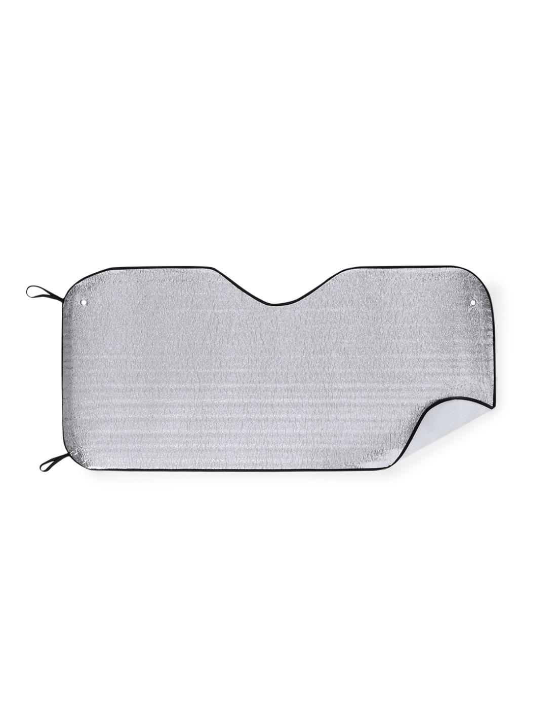 Parasol en aluminio a una cara en color plateado de acabado metalizado con ribetes de poliéster en vivos colores. De tamaño 130x60cm y espuma en el reverso. Cintas elásticas de ajuste con argollas metálicas de refuerzo, dos ventosas para ajuste en luna y presentación desplegado en plancha para fácil impresión.