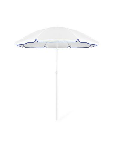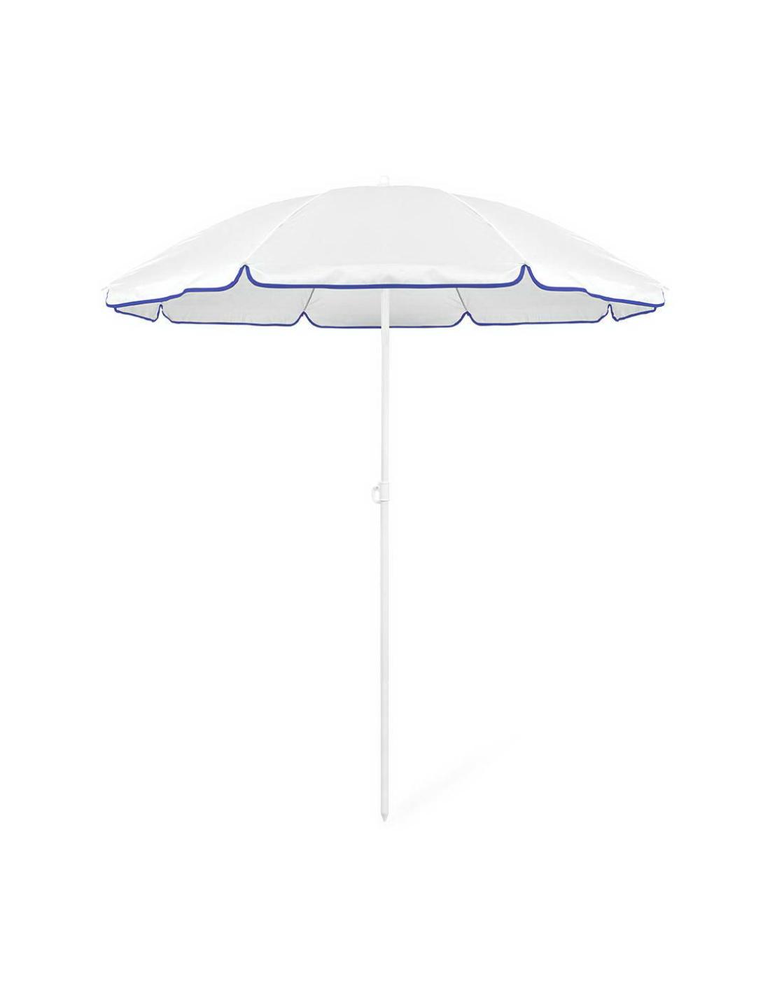 Sombrilla de playa de 8 paneles de resistente nylon en variada gama de vivos colores. De 150cm de diámetro, con faldones laterales ribeteados, tubos metalizados en color blanco y ajustable en altura. Presentada en funda de PVC con cinta de transporte para hombro.