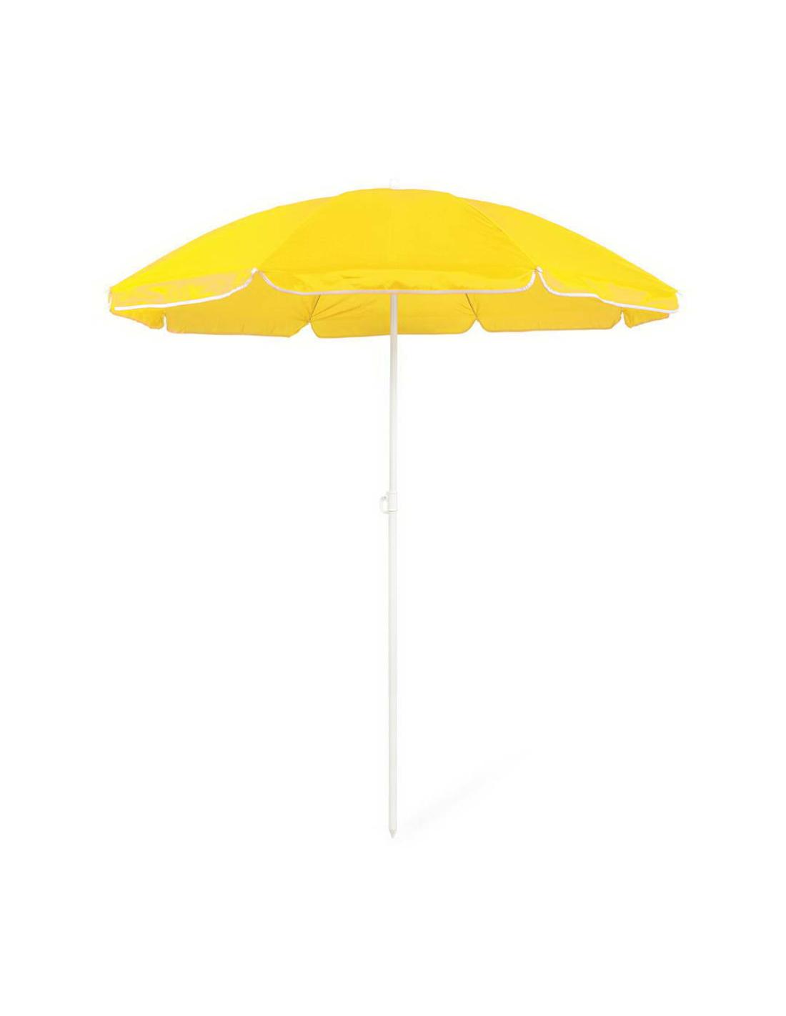 Sombrilla de playa de 8 paneles de resistente nylon en variada gama de vivos colores. De 150cm de diámetro, con faldones laterales ribeteados, tubos metalizados en color blanco y ajustable en altura. Presentada en funda de PVC con cinta de transporte para hombro.