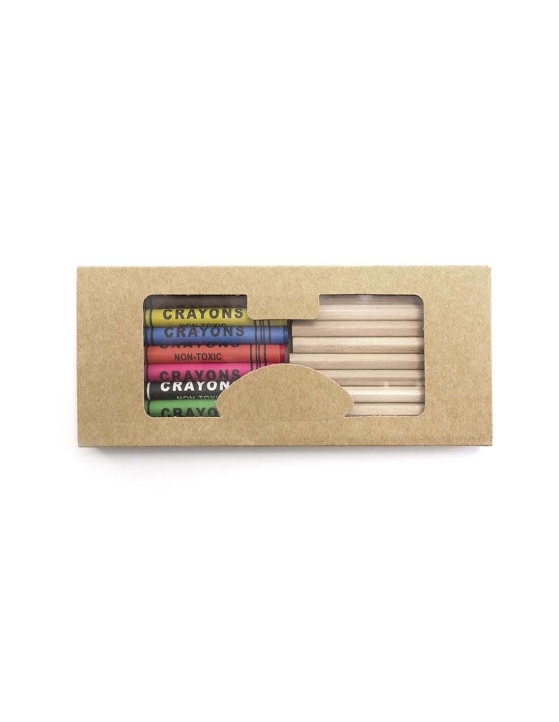 Set de 19 piezas en estuche con cuerpo en cartón natural con ventana y bandeja interior. Contiene ceras de cuerpo cilíndrico y lápices de madera natural de cuerpo hexagonal en variados colores.