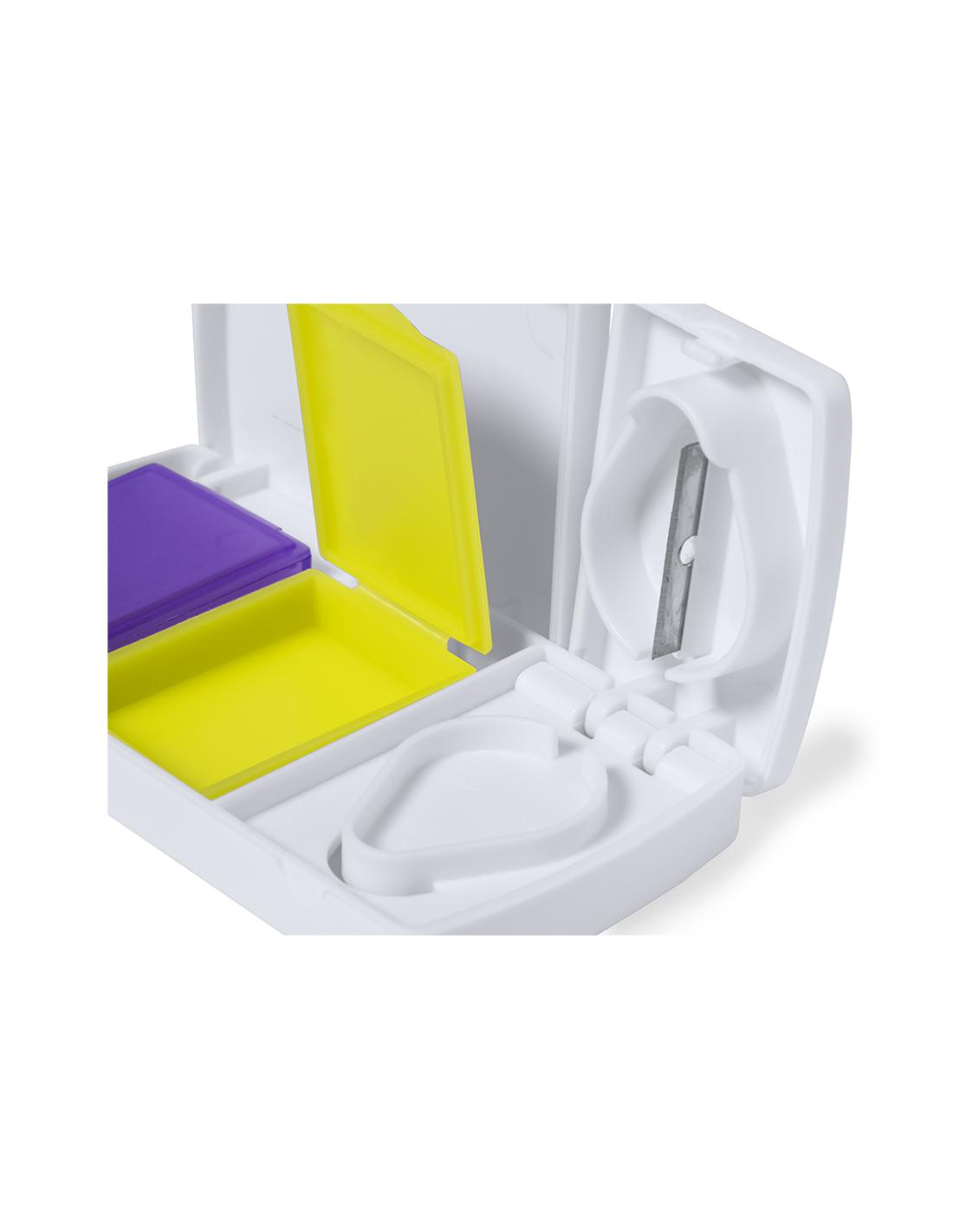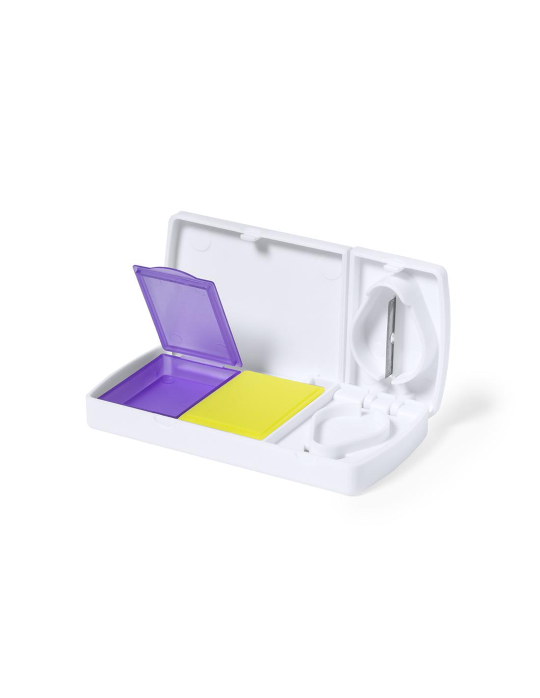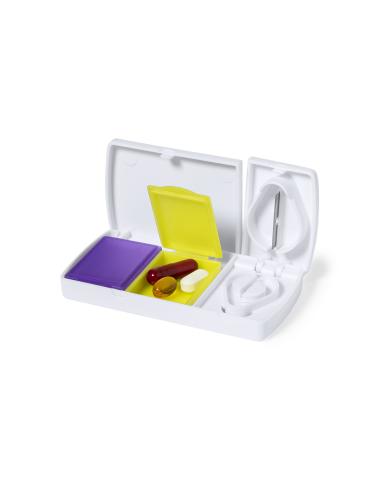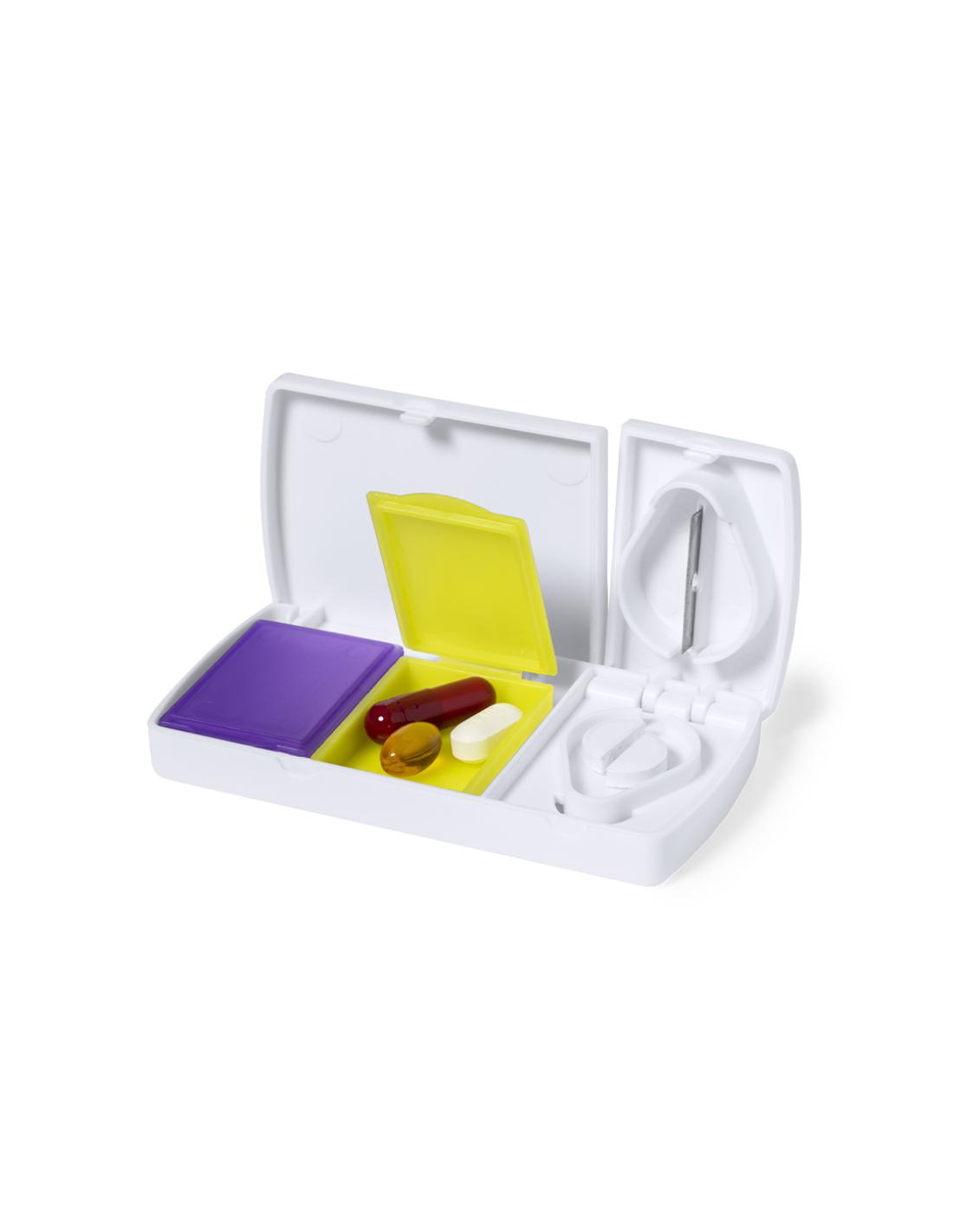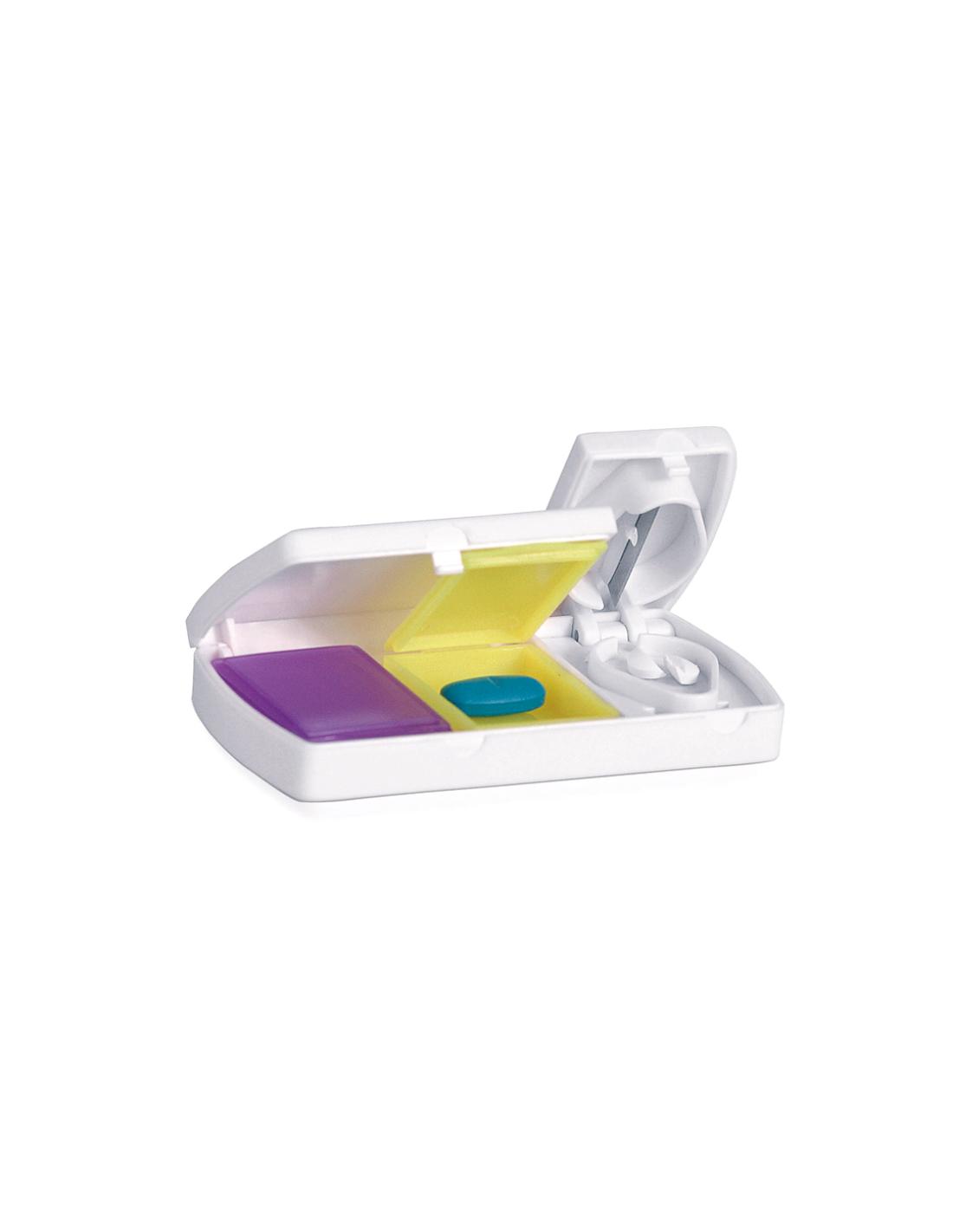 Pastillero en suave y resistente material acabado en color blanco. Con 2 cajitas interiores, cierre de seguridad y cuchilla para partir pastillas.