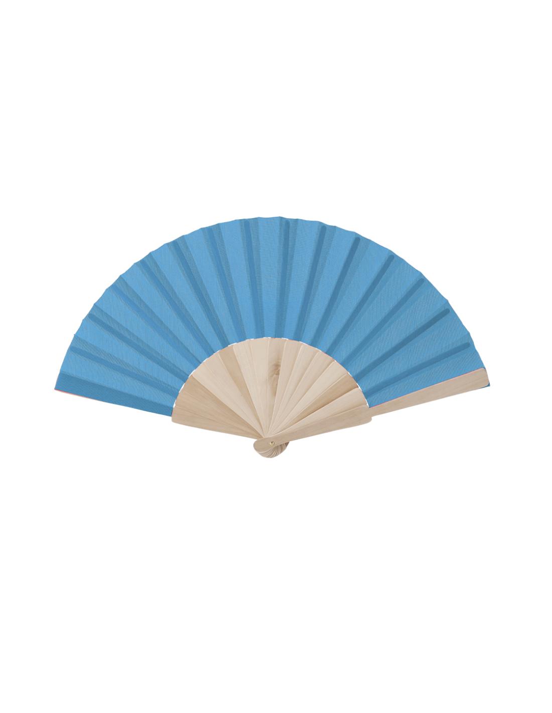 Abanico de línea nature con varillas fabricadas en resistente madera de acabado natural. Tela en resistente poliéster 190T, disponible en variada gama de colores y presentado en una caja de cartón individual blanca.