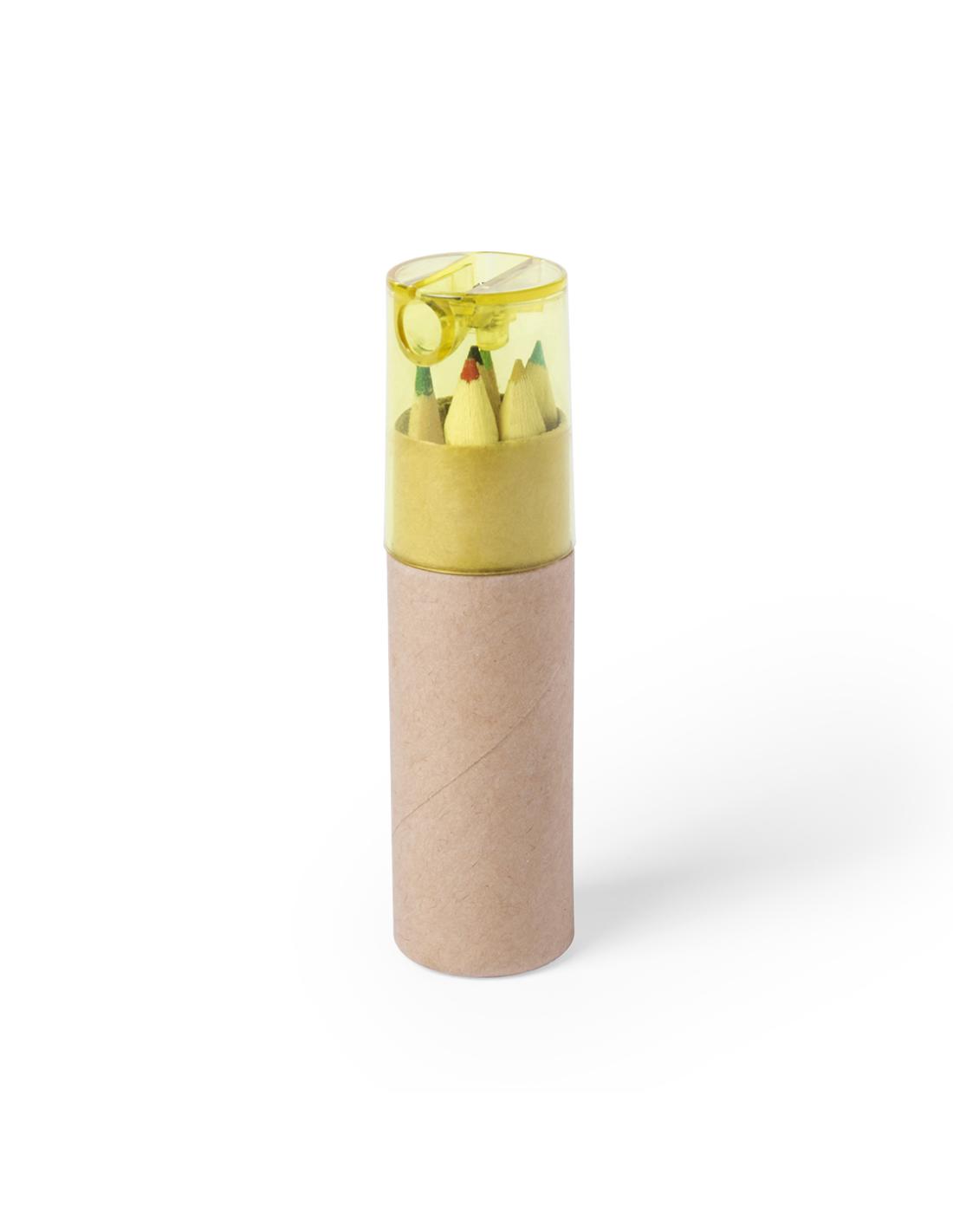 Set de 7 piezas en estuche con cuerpo en cartón natural y capucha transparente en variados colores. Incluye 6 lápices de madera con cuerpo hexagonal de acabado natural y sacapuntas integrado en tapadera.