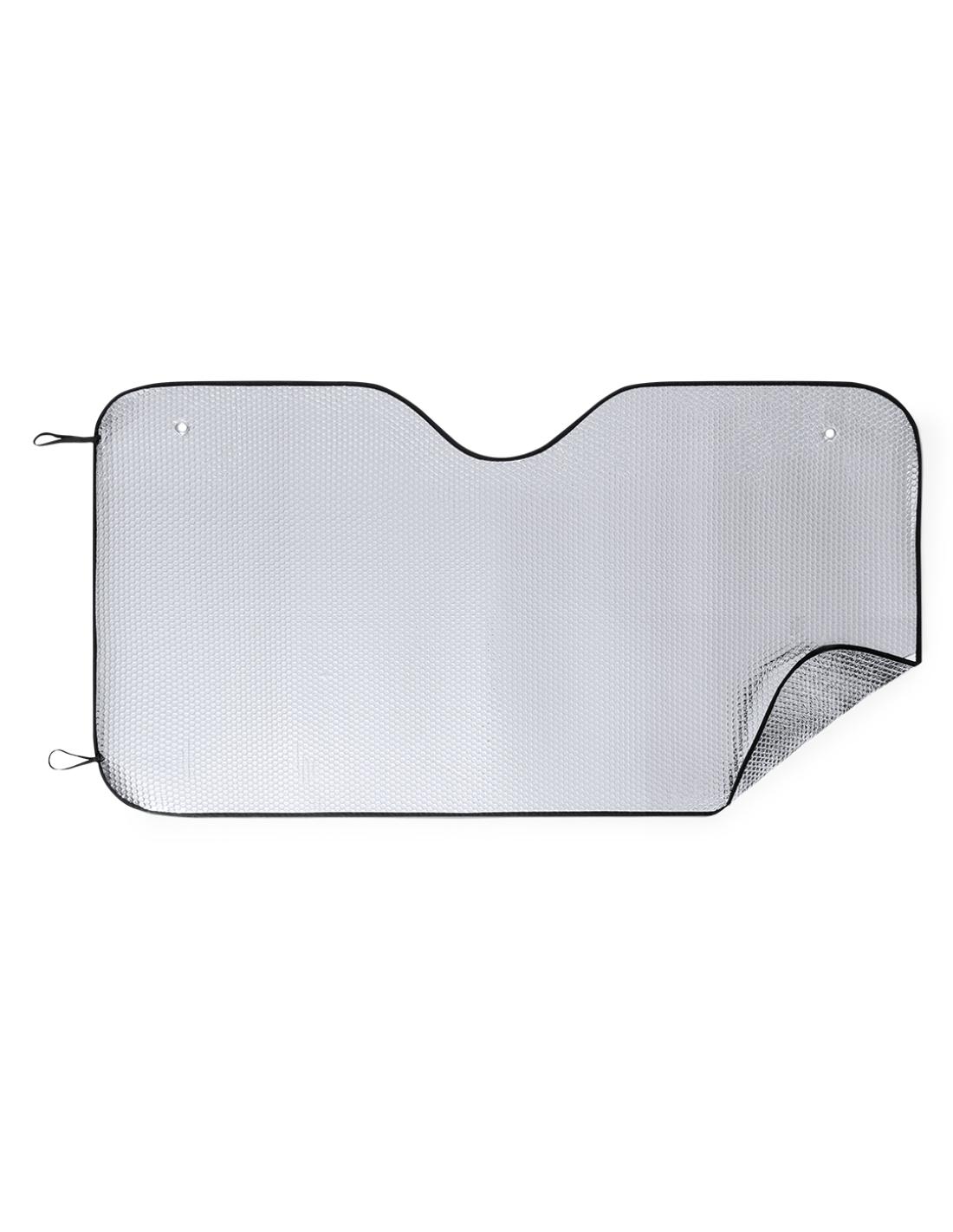 Parasol en aluminio con burbuja en ambas caras en color plateado de acabado metalizado con ribetes en color negro. De tamaño maxi 143x74cm, con argollas metálicas de refuerzo, cintas elásticas para plegado, dos ventosas para ajuste en luna y presentación desplegado en plancha para fácil impresión.