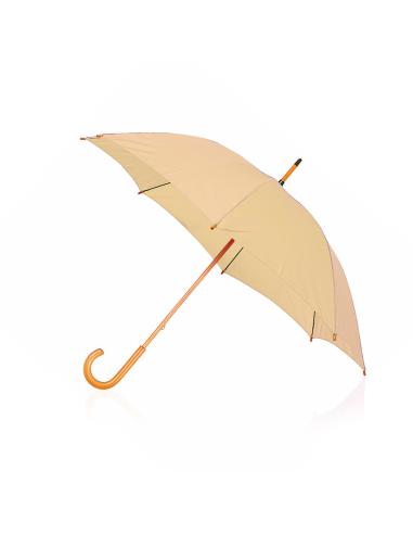 Paraguas de 8 paneles confeccionado en poliéster. De 105cm de diámetro, con apertura manual, varillas metálicas en color negro y cierre de velcro. Palo y mango fabricados en suave madera de color natural, con tela en variada gama de vivos colores.