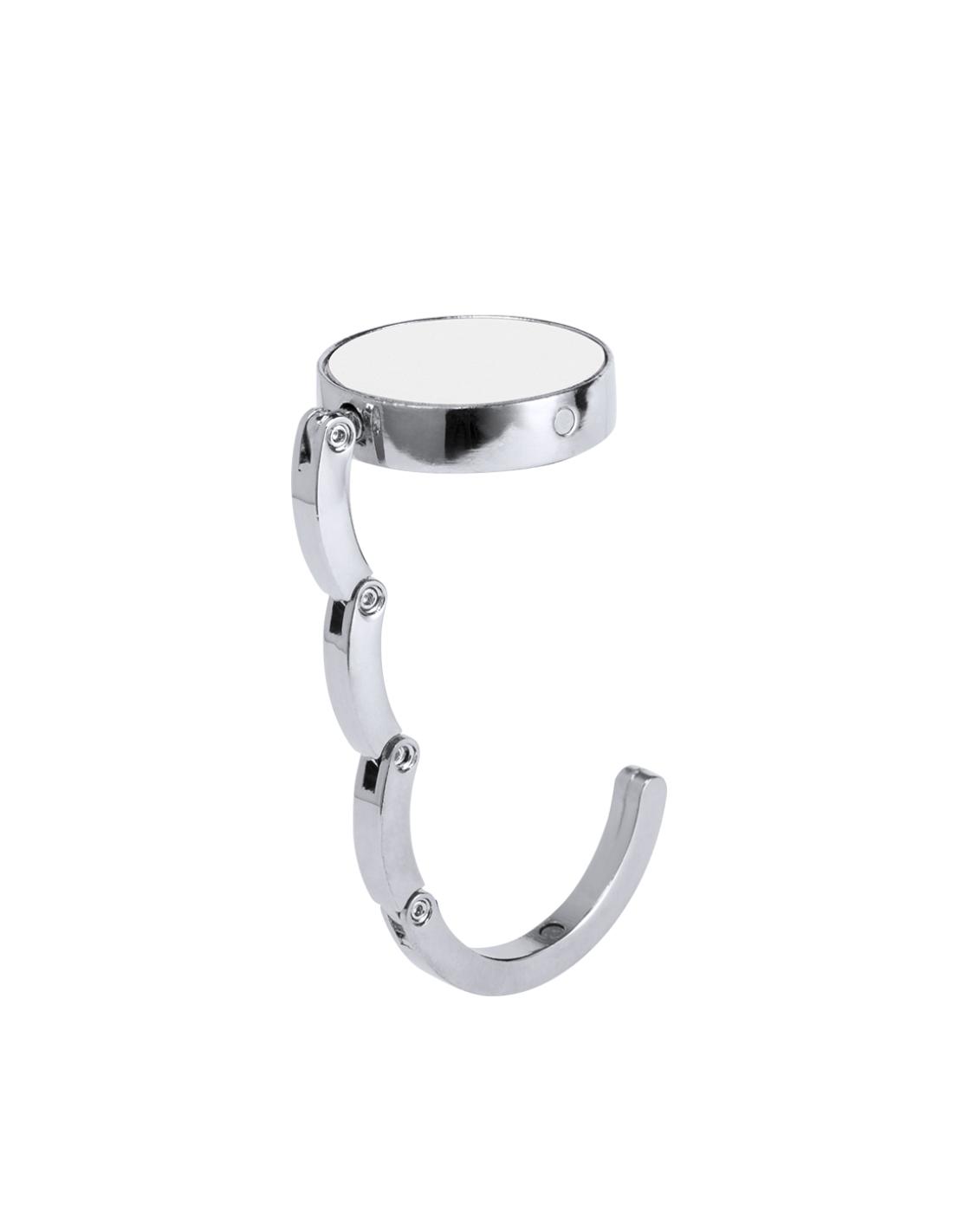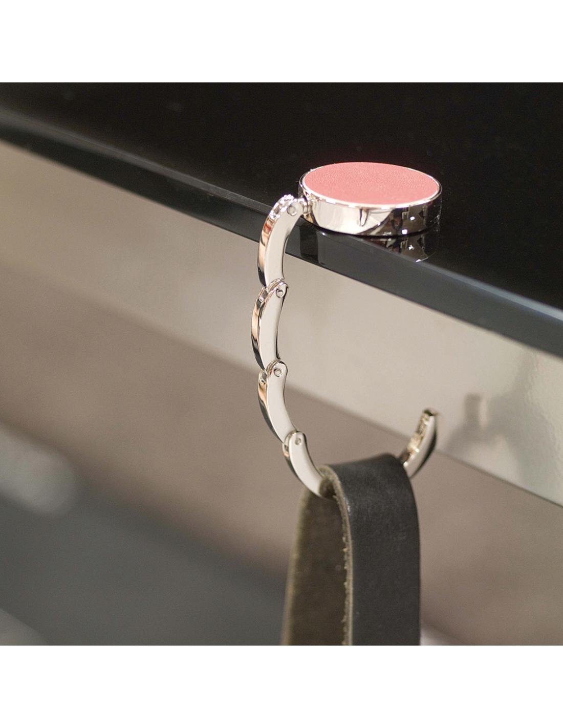 Cuelgabolsos metálico plegable con corona en polipiel de vivos colores. Presentado en estuche individual con interior troquelado.