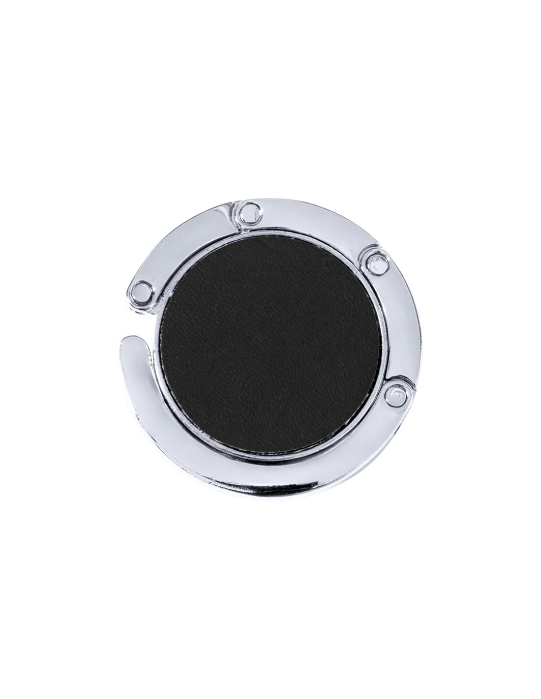 Cuelgabolsos metálico plegable con corona en polipiel de vivos colores. Presentado en estuche individual con interior troquelado.