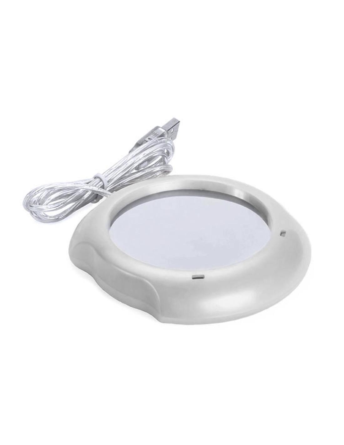 Calentador de tazas con conexión USB y de superficie metálica, especialmente diseñada para mantener el calor. De elegante diseño en color gris y compatible con tazas de hasta 7,4cm de diámetro, incorpora interruptor en la parte trasera y luces de estado. Presentada en caja individual.