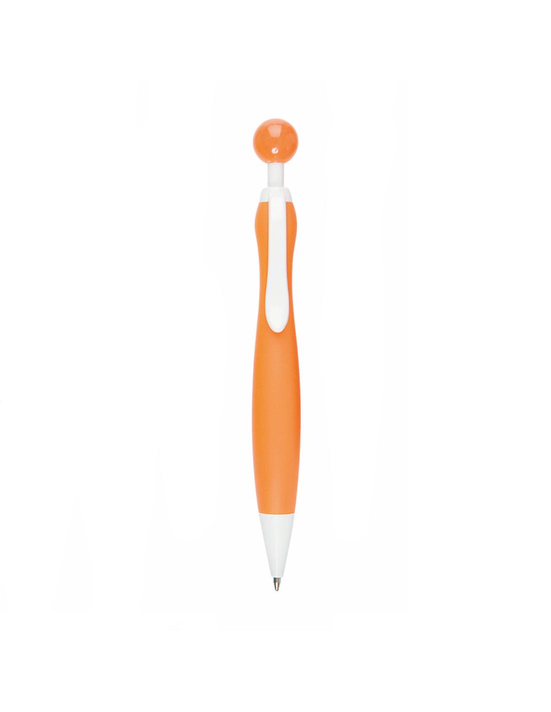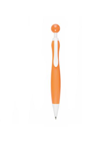 Bolígrafo de mecanismo pulsador de atrevido diseño bicolor con accesorios en color blanco sólido y cuerpo curvado de suave acabado en llamativos colores sólidos. Con original clip pulsador en forma de bola a juego. De cartucho jumbo y tinta azul.