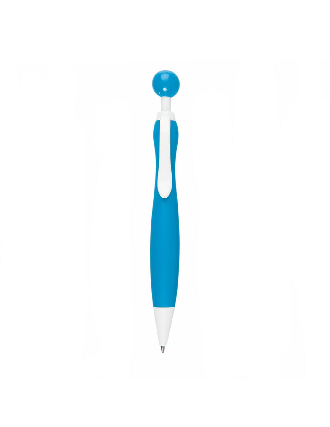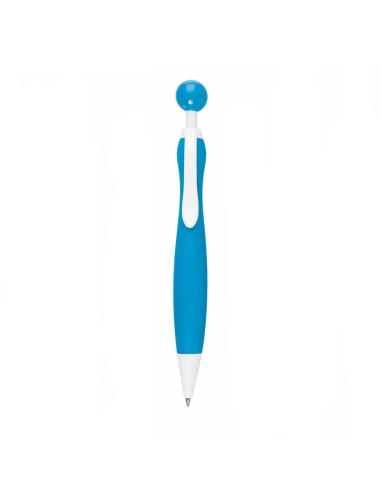 Bolígrafo de mecanismo pulsador de atrevido diseño bicolor con accesorios en color blanco sólido y cuerpo curvado de suave acabado en llamativos colores sólidos. Con original clip pulsador en forma de bola a juego. De cartucho jumbo y tinta azul.