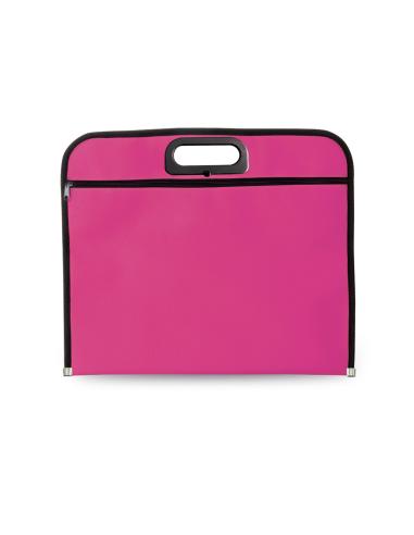 Portadocumentos de cierre de cremallera en suave acabado de poliéster 600D de vivos colores. Con asas de transporte de original diseño troquelado con refuerzo y ribetes en color negro con chapa metálica de refuerzo en la base.