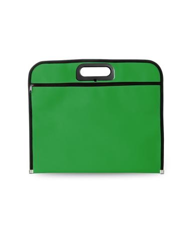 Portadocumentos de cierre de cremallera en suave acabado de poliéster 600D de vivos colores. Con asas de transporte de original diseño troquelado con refuerzo y ribetes en color negro con chapa metálica de refuerzo en la base.