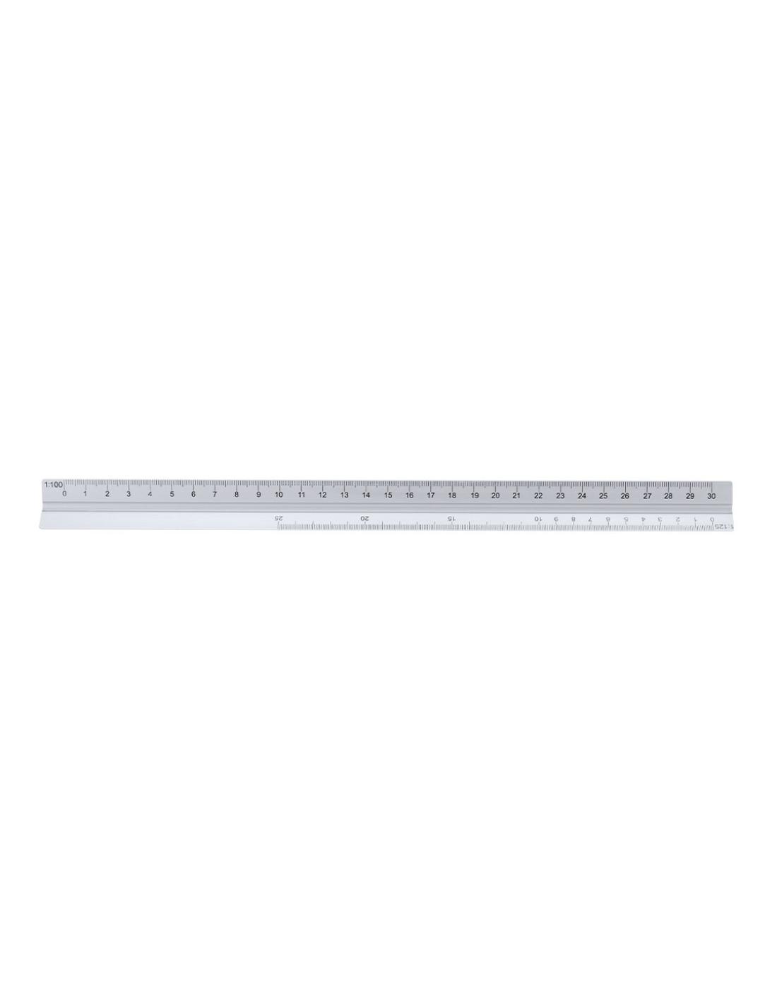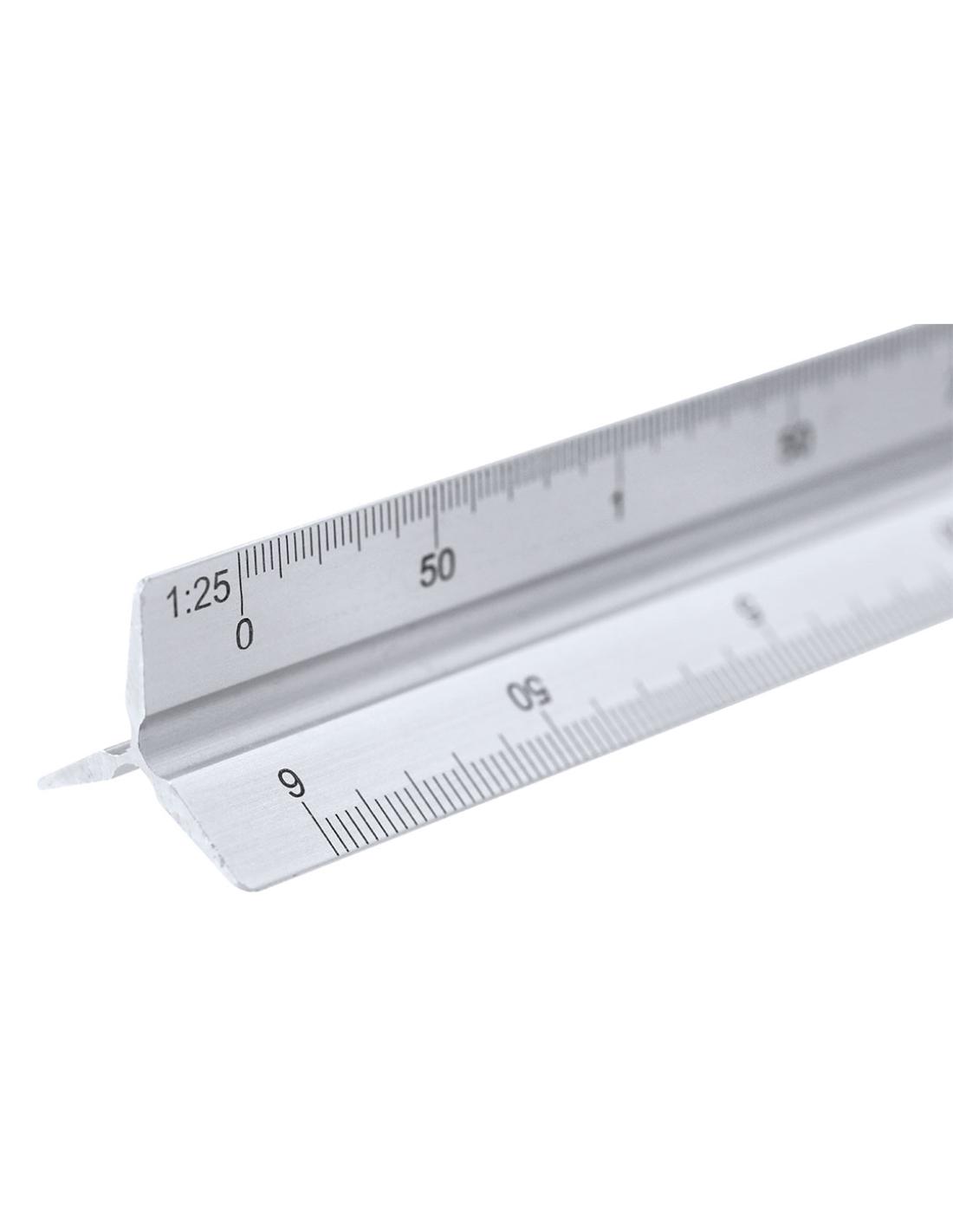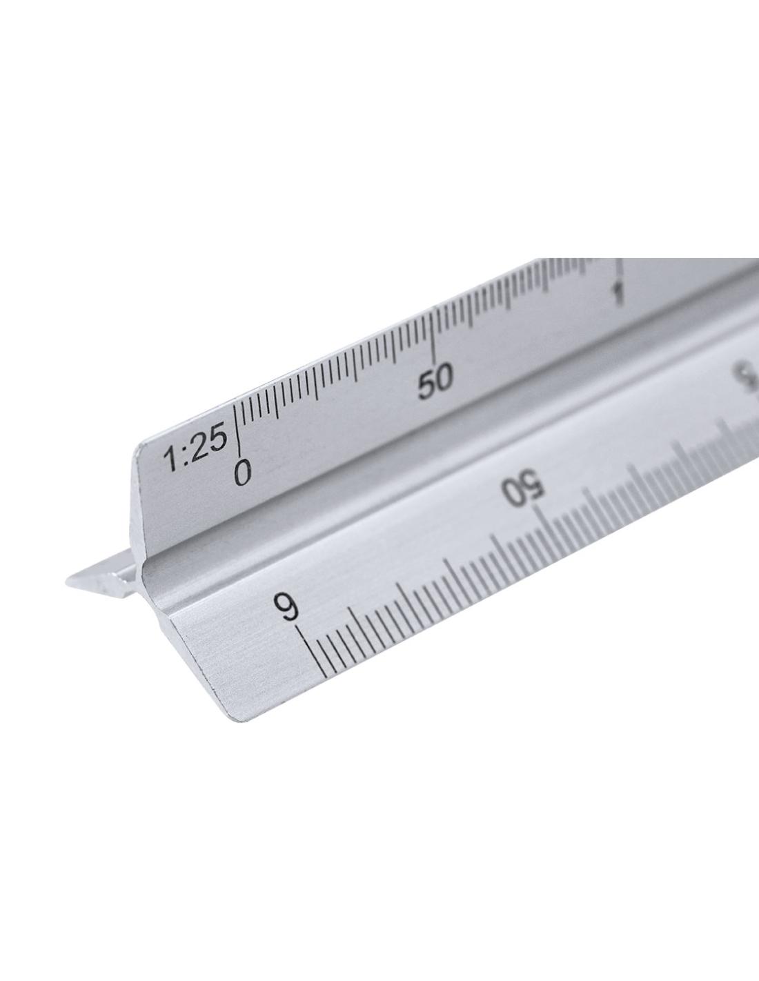 Escalímetro de aluminio en diseño triangular de 30cm. Escalas 1:20/1:25/1:50/1:75/1:100. Con cara lisa para marcaje. Presentado en caja individual.