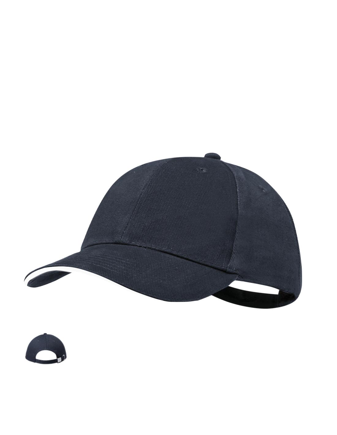 Gorra de 6 paneles fabricada en resistente algodón peinado de 250g/m2. Con sandwich en visera, orificios de ventilación bordados y cierre con hebilla metálica.