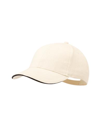 Gorra de 6 paneles fabricada en resistente algodón peinado de 250g/m2. Con sandwich en visera, orificios de ventilación bordados y cierre con hebilla metálica.