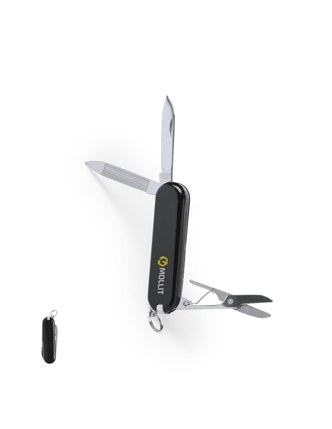 Mininavaja multiusos con accesorios de acero inox, de 6 funciones en variados colores. Incluye navajas, pinzas, lima, palillo, anilla para llavero y tijeras. Presentada en caja individual.