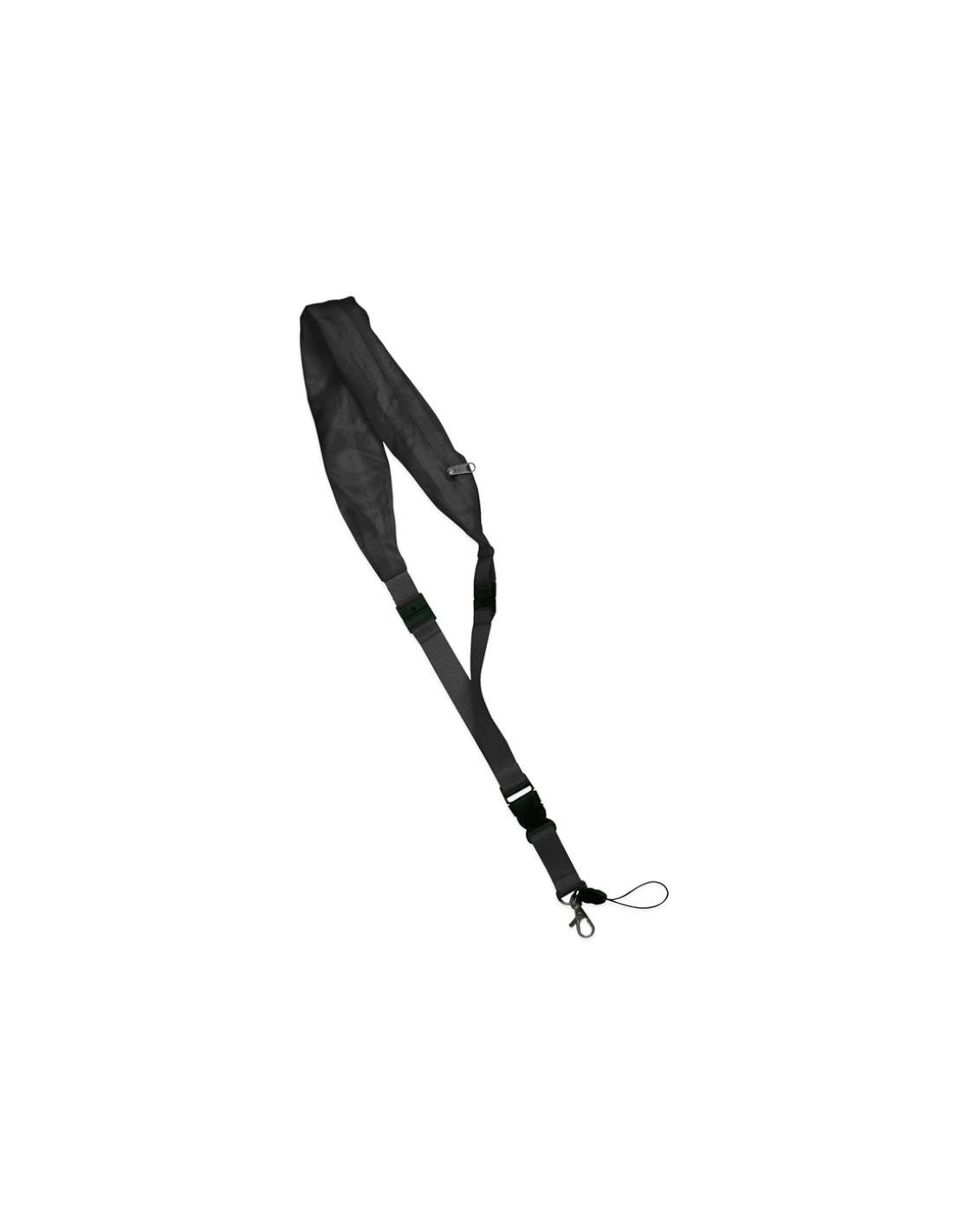 Lanyard en resistente y suave poliéster de variados colores con gorro impermeable en nylon integrado en cuello y cierre de cremallera. Desmontable con cierres de clip y accesorios mosquetón metálico y cinta.
