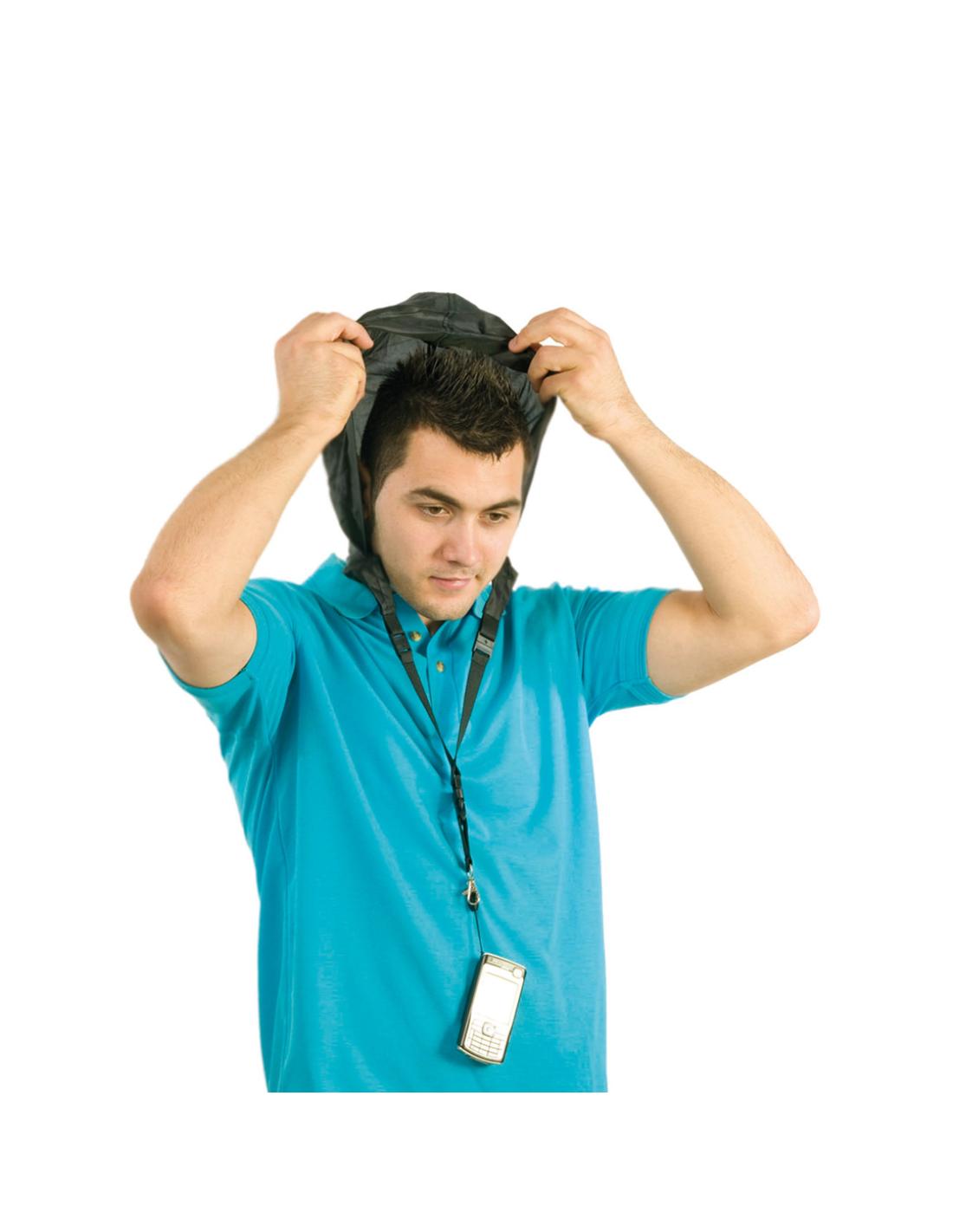 Lanyard en resistente y suave poliéster de variados colores con gorro impermeable en nylon integrado en cuello y cierre de cremallera. Desmontable con cierres de clip y accesorios mosquetón metálico y cinta.