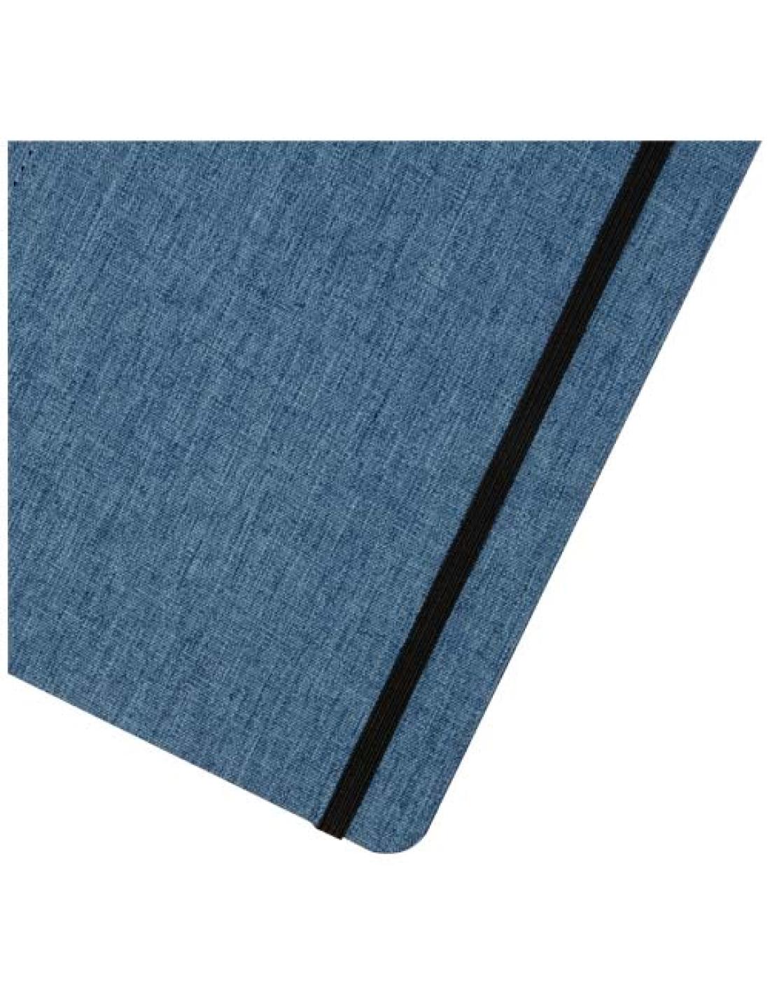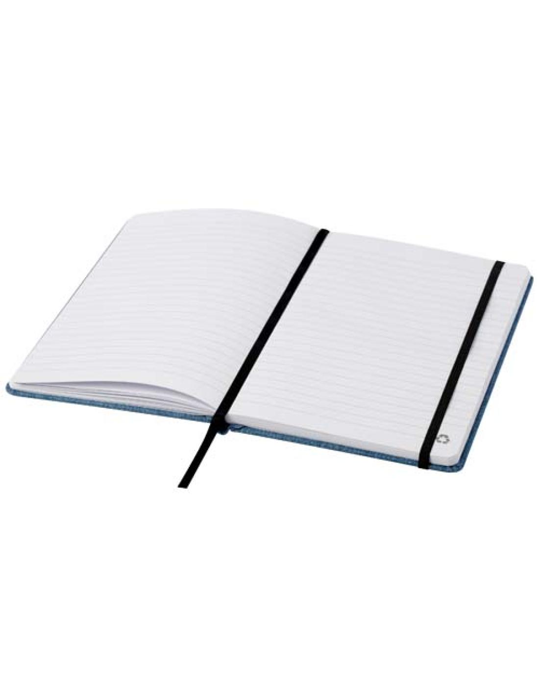 Libreta de tamaño A5 con tapa de tejido de PET reciclado. Cuenta con 96 hojas de papel reciclado de 70 g/m² con diseño rayado, soporte para bolígrafo y cinta marcapáginas. Embalado en una funda de cartón.