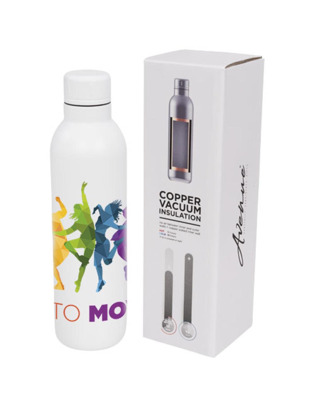 Botella duradera de construcción al vacío de acero inoxidable de doble pared con aislamiento de cobre para que tus bebidas se mantengan frías durante 48 horas y al menos 12 horas con las bebidas calientes. Esta construcción también evita la condensación en el exterior de la botella. Moderna y duradera pintura en polvo. Tapa antivertido de rosca de acero inoxidable. Capacidad en volumen 510 ml. Se presenta en un estuche de regalo de Avenue.