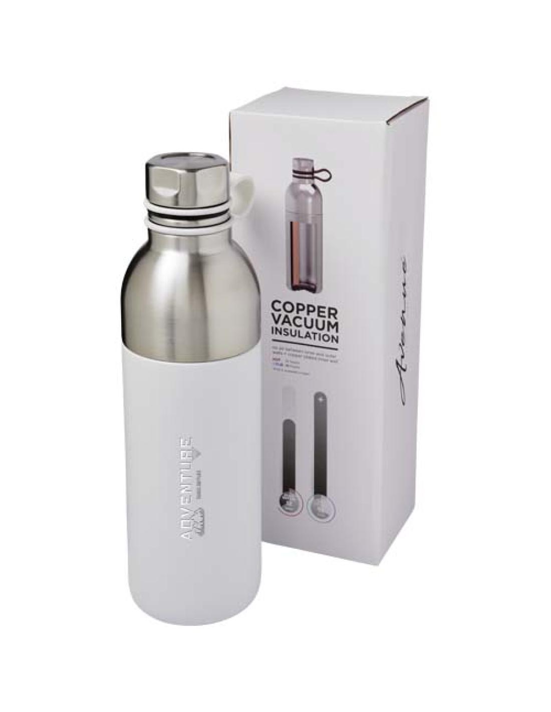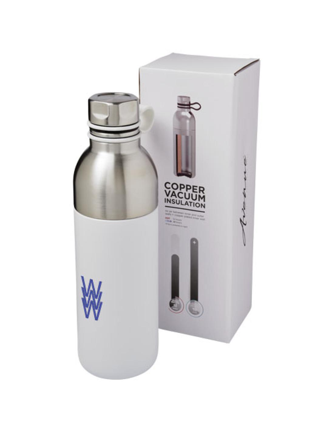 Construcción al vacío de acero inoxidable duradero, de doble pared, con aislamiento de cobre, que conserva las bebidas frías durante 48 horas y calientes durante al menos 12 horas. La construcción también impide la condensación en el exterior del bidón. Cuenta con parte superior de rosca y tapa de acero inoxidable con un asa cómoda de silicona. Construcción de doble abertura para una fácil limpieza y llenado. Capacidad de 590ml. Se presenta en una caja de regalo "Avenue".