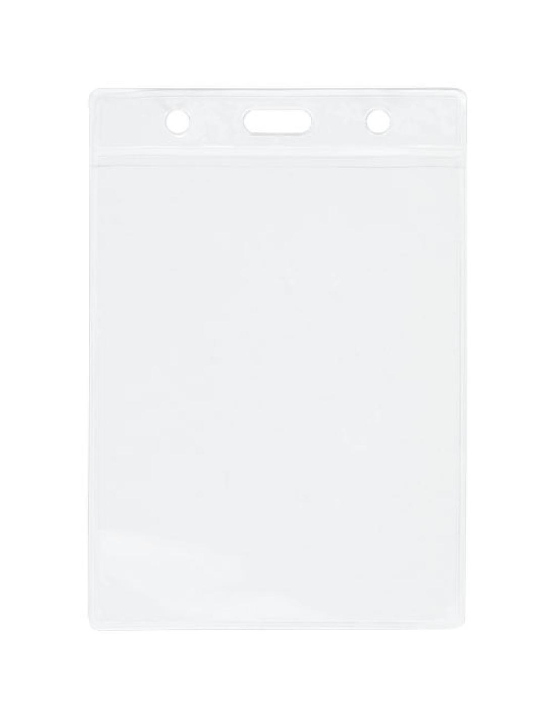 Un portatarjetas de inserción en la parte trasera y ojal superior para sujetar a un cordón identificativo o llavero extensible. Este artículo puede llevar una tarjeta de 9,2 x 7,8 cm.
