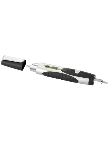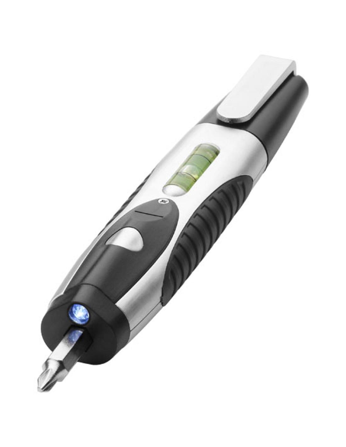 Un destornillador compacto con puntas de estrella grande y pequeña, puntas planas grande y pequeña y una luz LED con interruptor de encendido/apagado. Pila incluida.