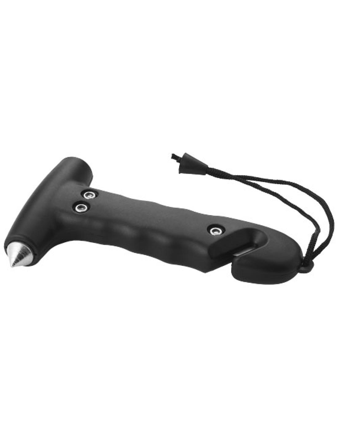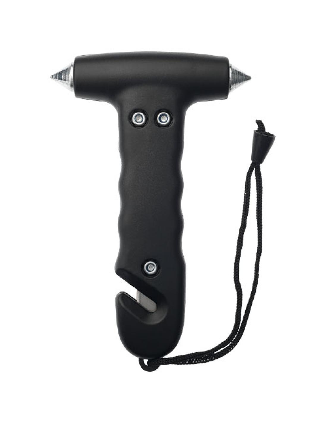Martillo de emergencia con correa de muñeca y cortacinturones integrado en el mango. Dos rompevidrios de acero endurecido en punta y un cortacinturones para escapar en caso de situaciones de peligro.