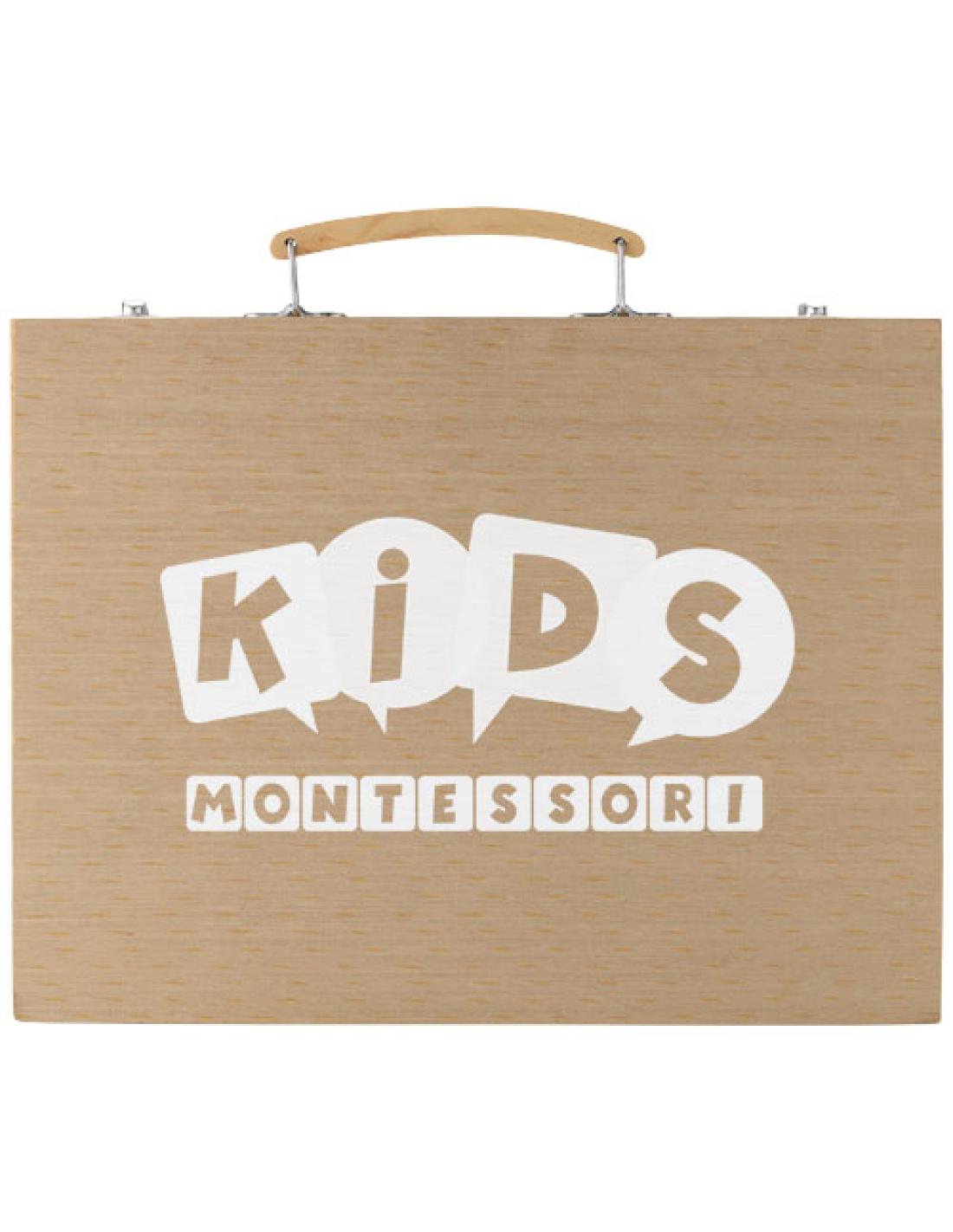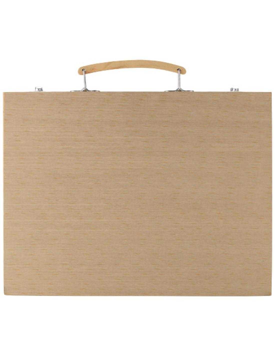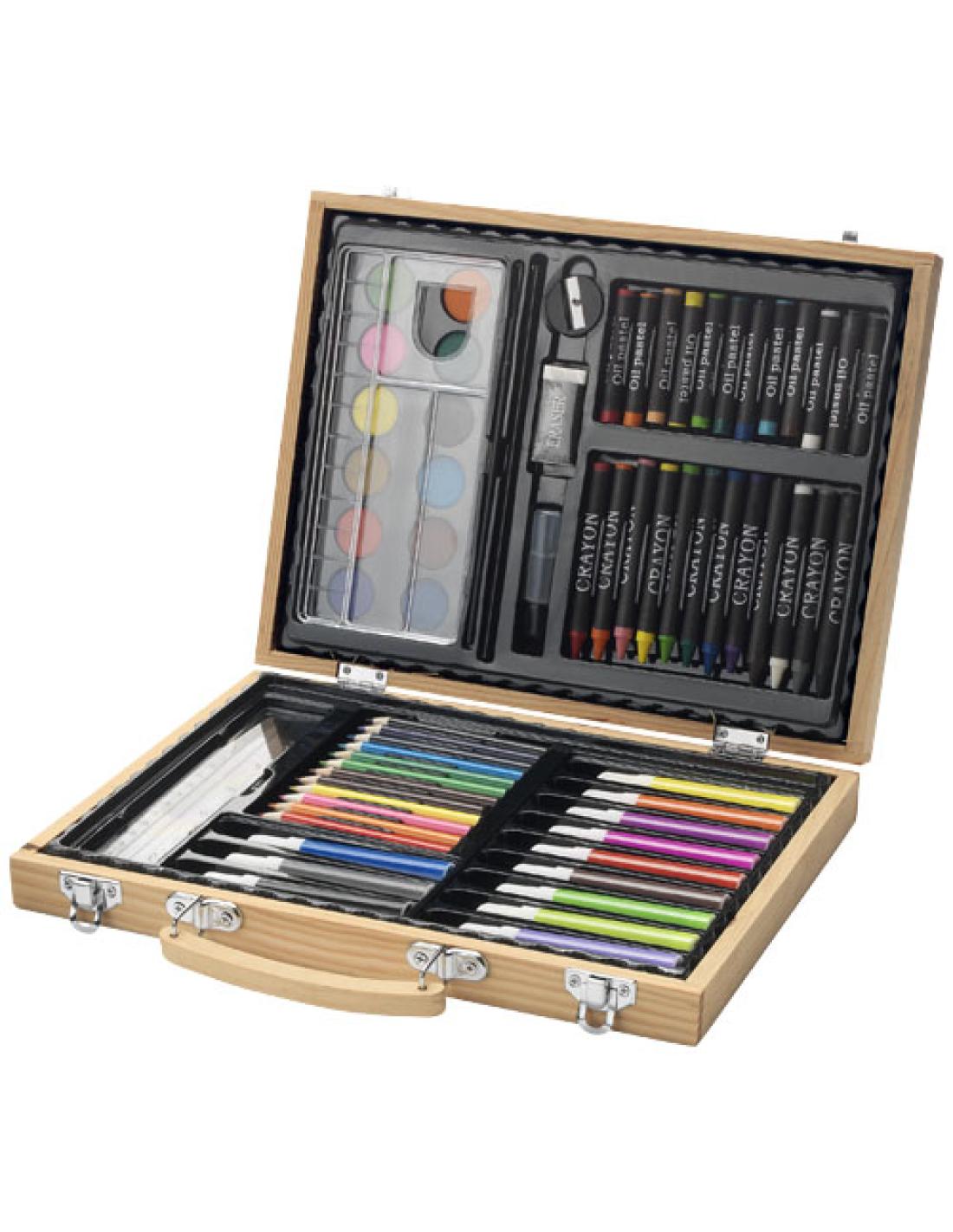 Set de 12 colores de acuarela, 12 lápices de colores, 12 rotuladores, 12 colores pastel al aceite, 12 ceras, paletas, pegamento, goma de borrar, sacapuntas, lápiz HB y pincel presentados en un estuche de madera. No permite la grabación de los componentes. ¡Advertencia! No apto para niños menores de tres años. Piezas pequeñas, peligro de asfixia; borde afilado funcional. No ingerir. Utilizar sólo bajo la supervisión de un adulto.