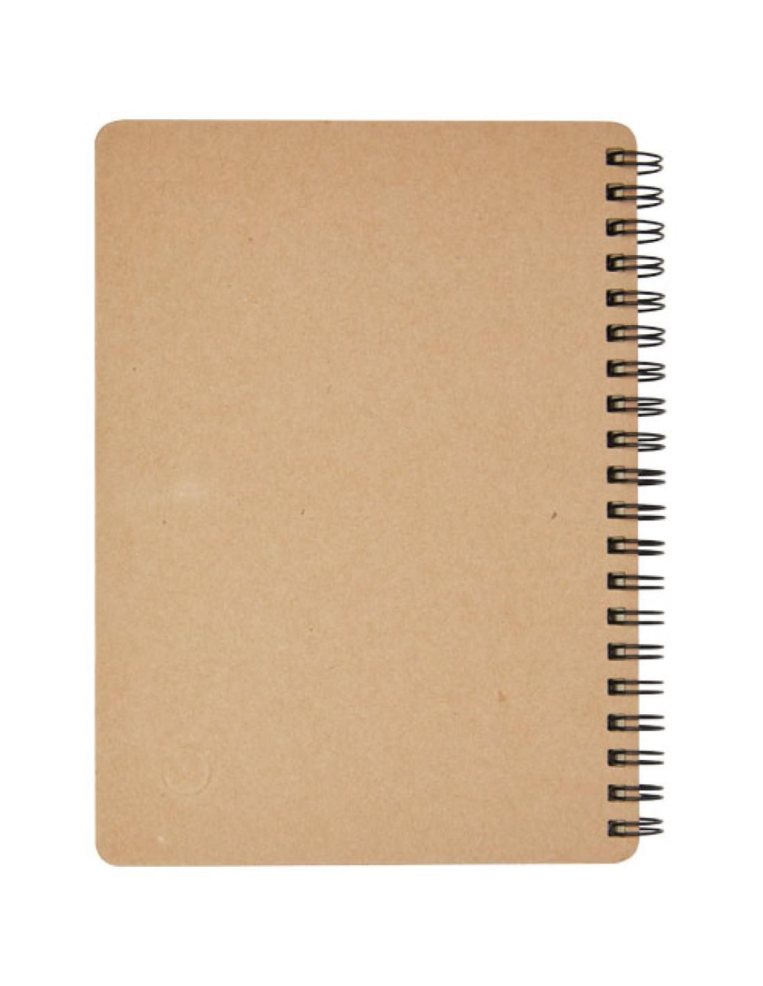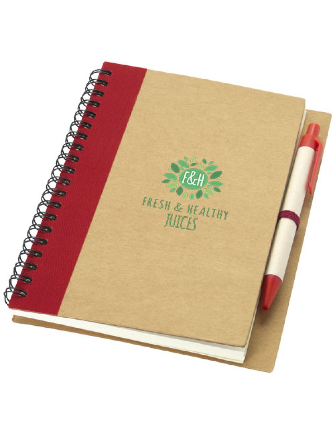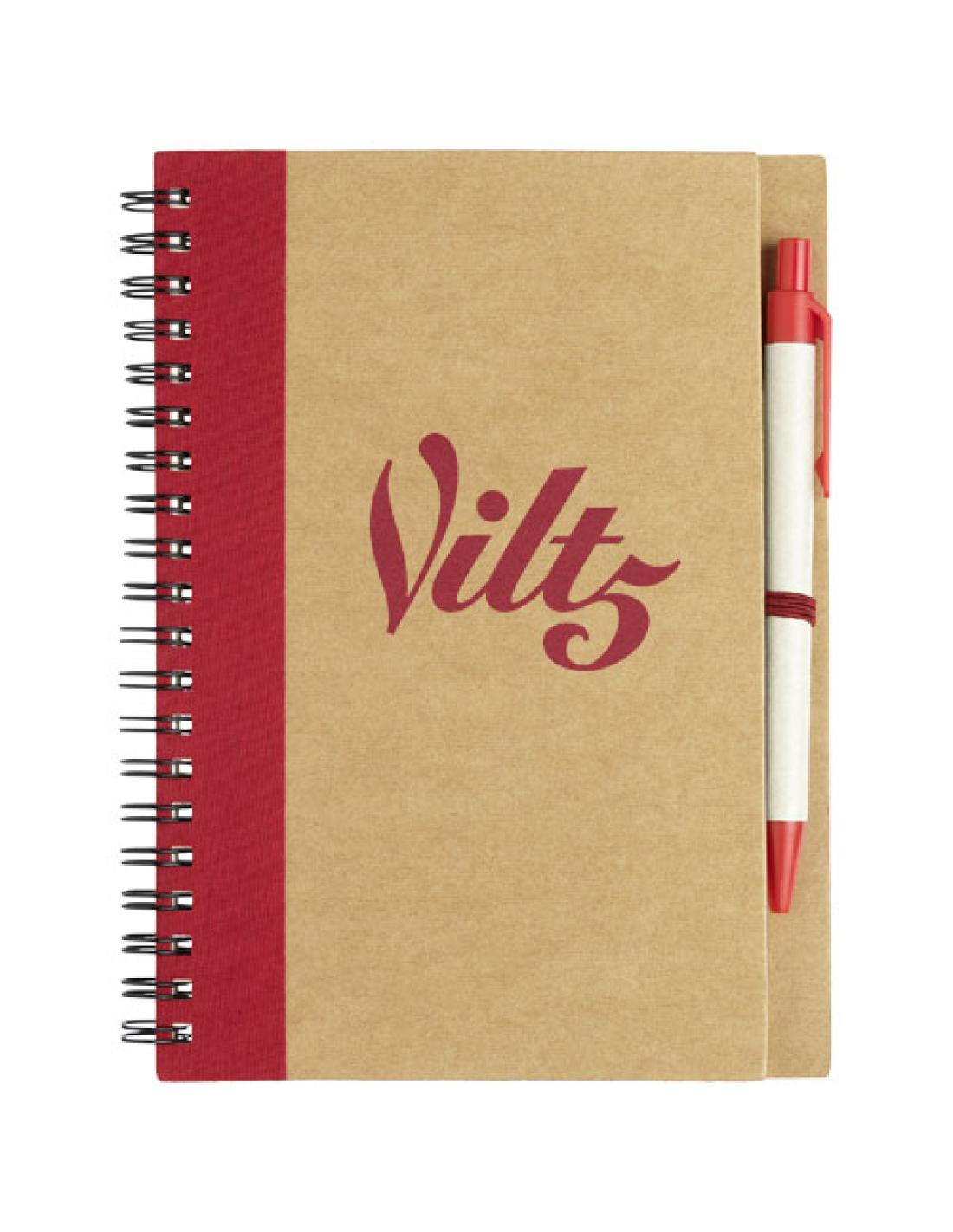 Cuaderno con cubierta de papel reciclado con 60 hojas de papel reciclado tamaño de referencia A6 rayado y un bolígrafo a juego. El cuaderno y el bolígrafo se empaquetan juntos.