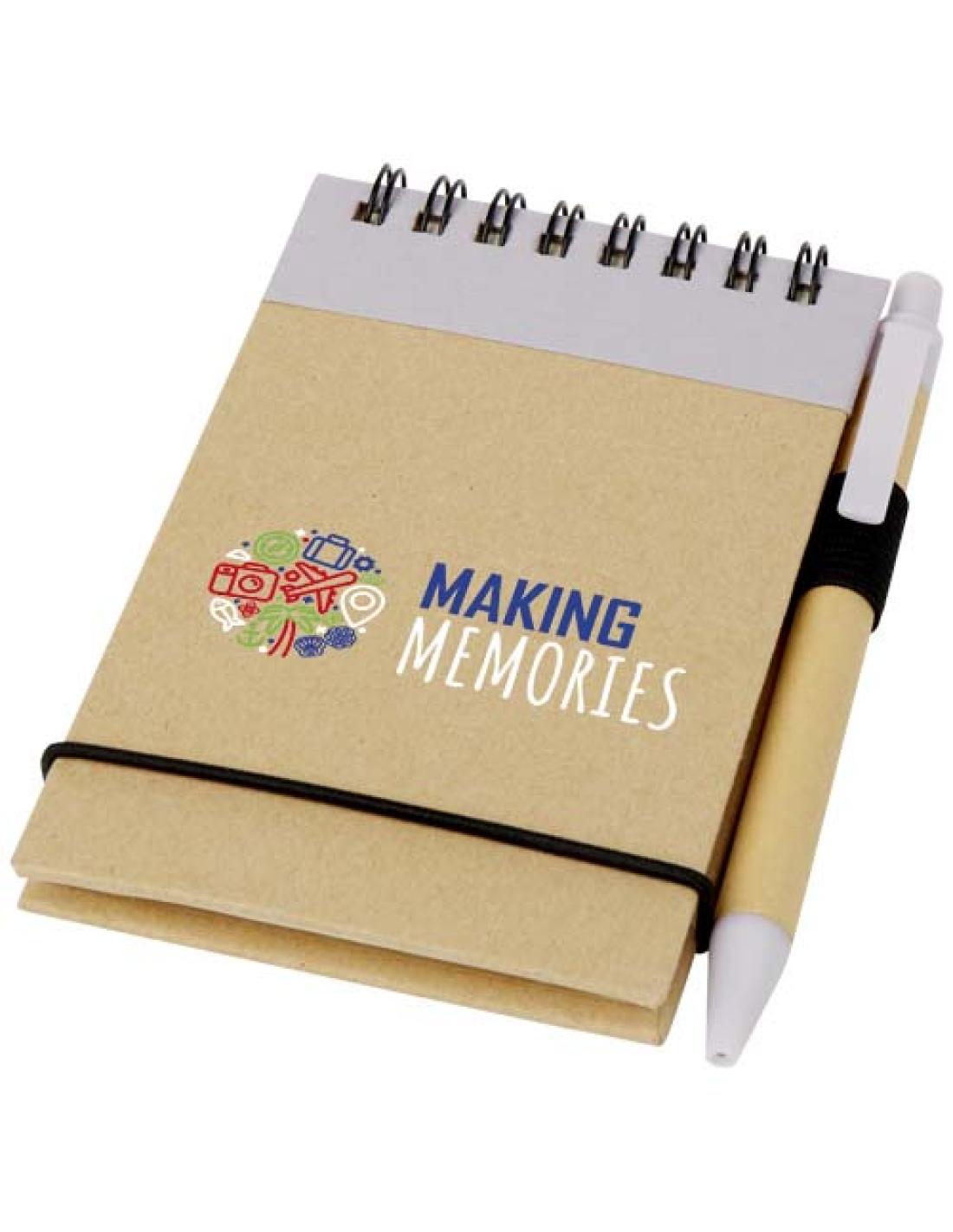 Anotar ideas rápidas es fácil con el bloc de notas reciclado Zuse con un bolígrafo en el mismo color. El pequeño bloc de notas contiene 40 hojas rayadas de papel reciclado de referencia A7, por lo que cabe bien en cualquier bolsa pequeña o grande, es fácil de sostener y, además, es una opción sostenible. Dispone de varias opciones de impresión para mostrar cualquier logotipo en el exterior de tapa dura.
