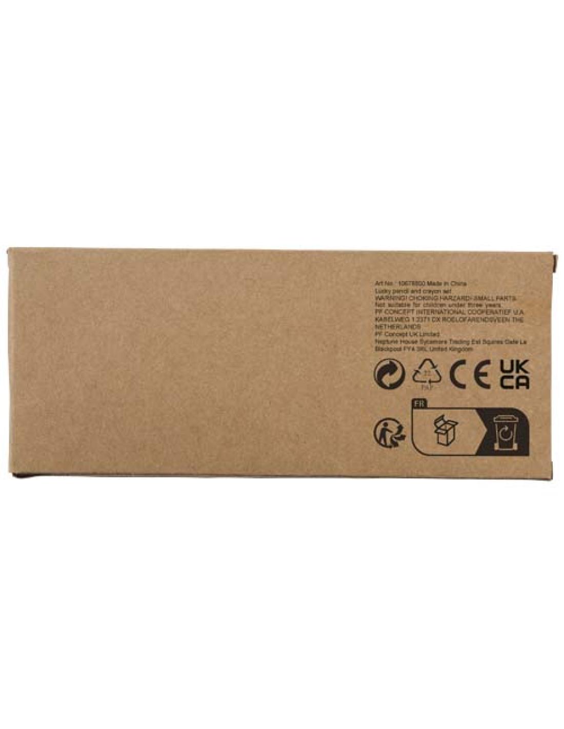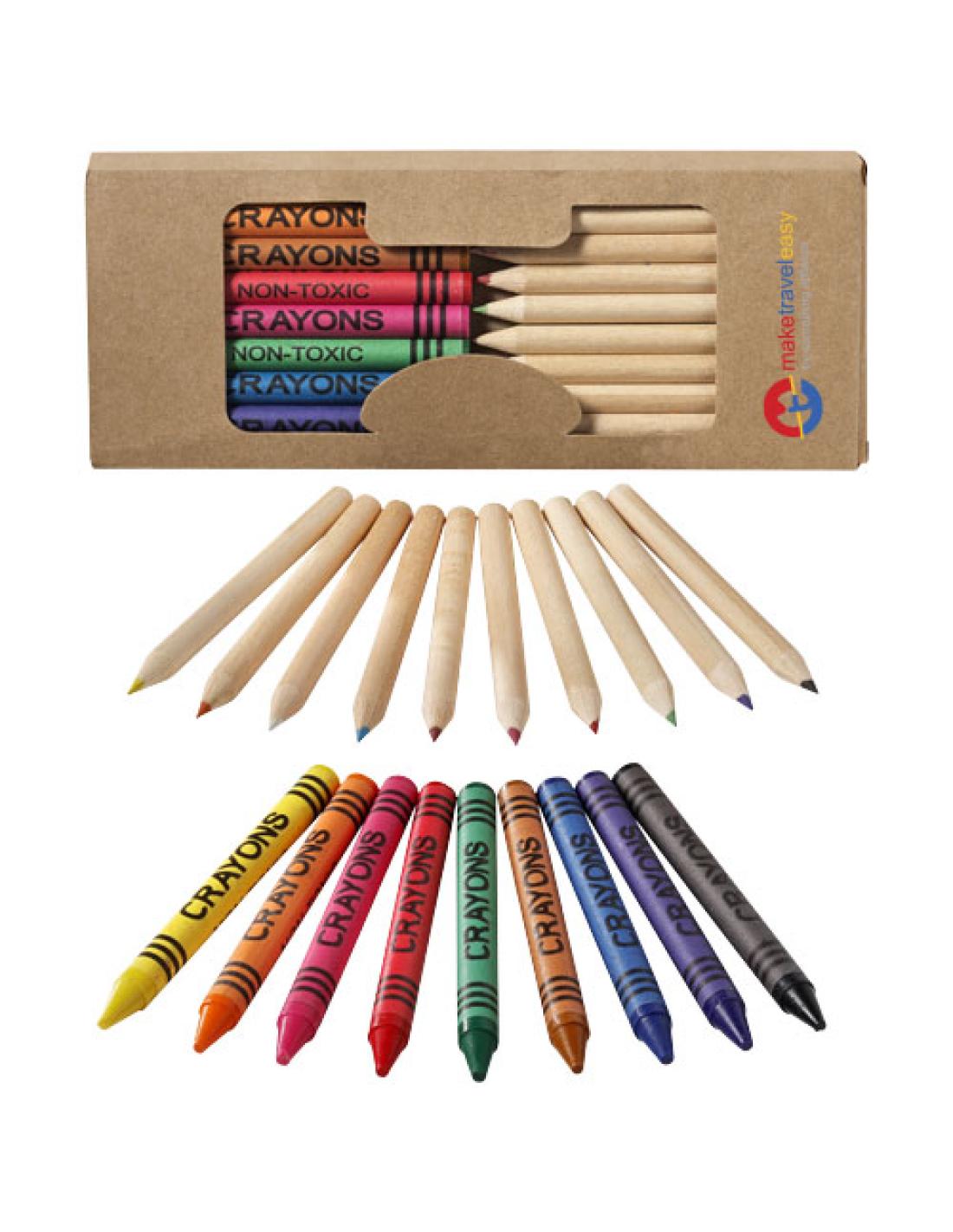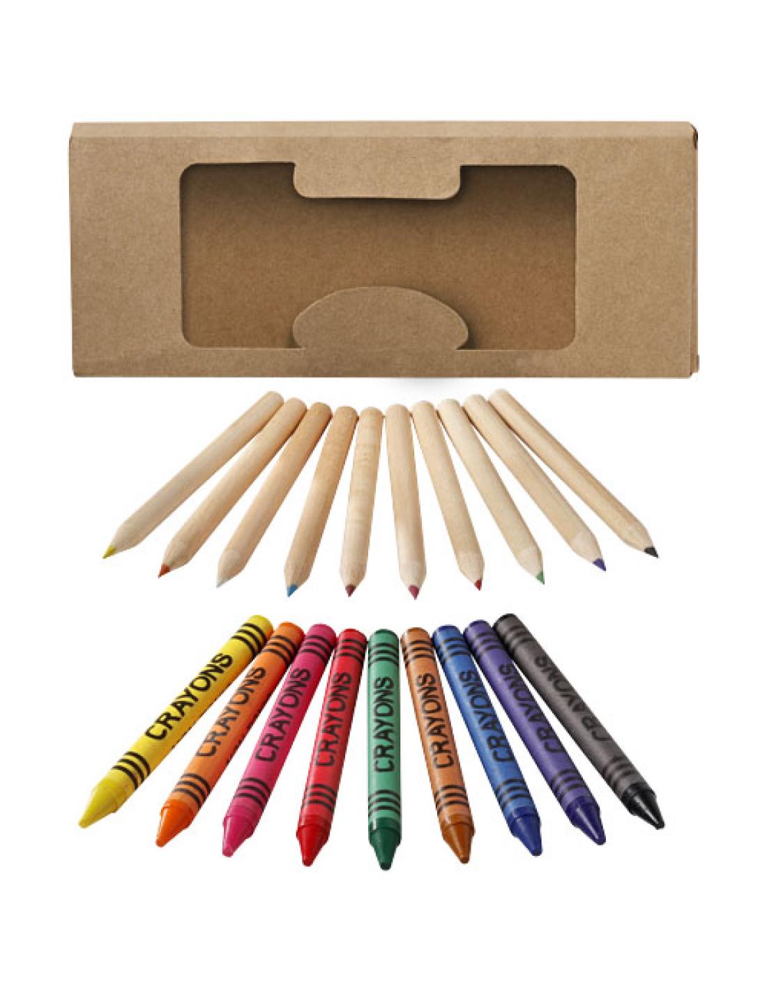 9 ceras de colores y 10 lápices de colores en una caja de cartón con ventanilla de plástico. No permite la grabación de los componentes.
