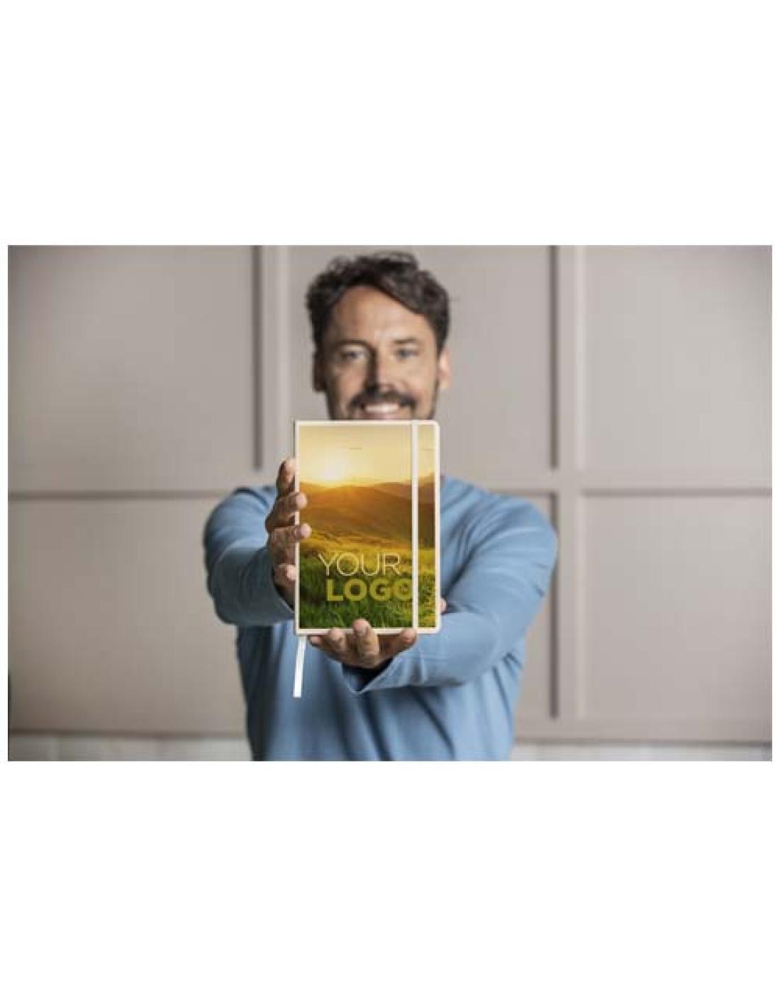 El cuaderno Spectrum no sólo es un elemento esencial para la oficina, sino también una gran oportunidad para promocionar tu marca. El cuaderno de cartón tiene una cubierta de tacto suave y 96 hojas rayadas de 60 g/m², ideales para anotar ideas rápidas o notas largas. El tamaño A5 es práctico, ya que cabe fácilmente en un bolso medio.