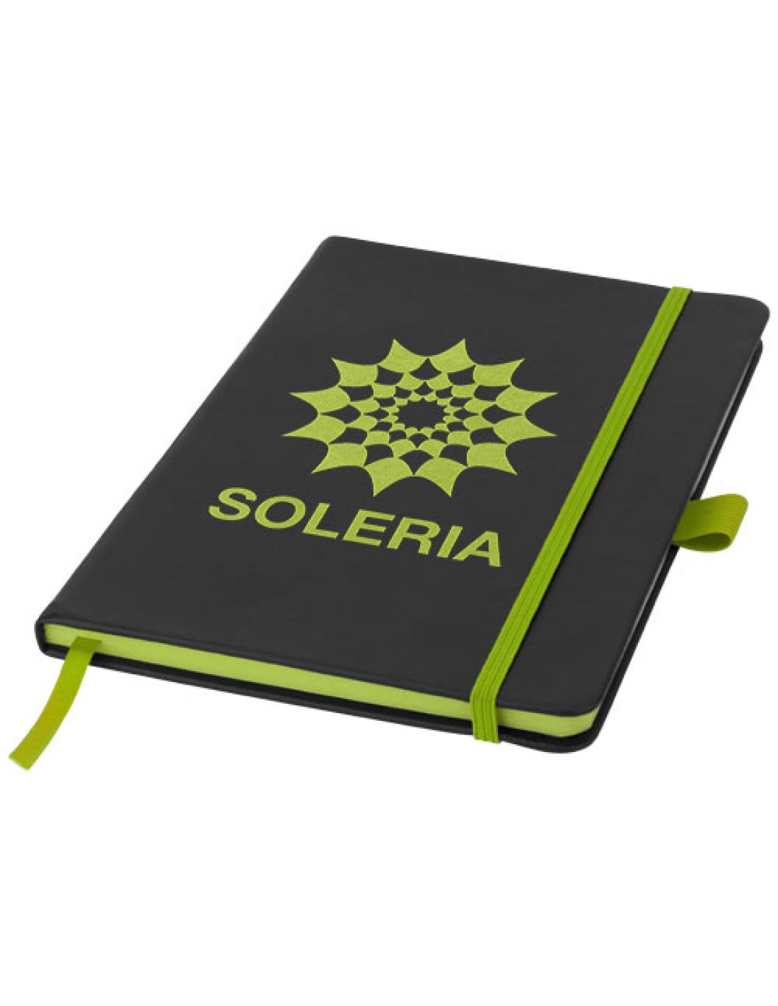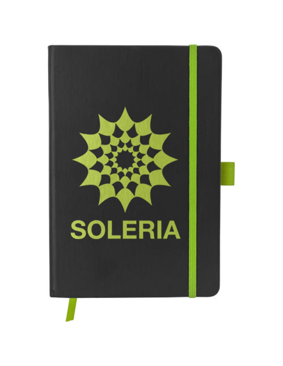 Libreta de tamañao A5, incluye 80 hojas de papel rayado beige (70 g/m2) con cinta y cierre elástico.