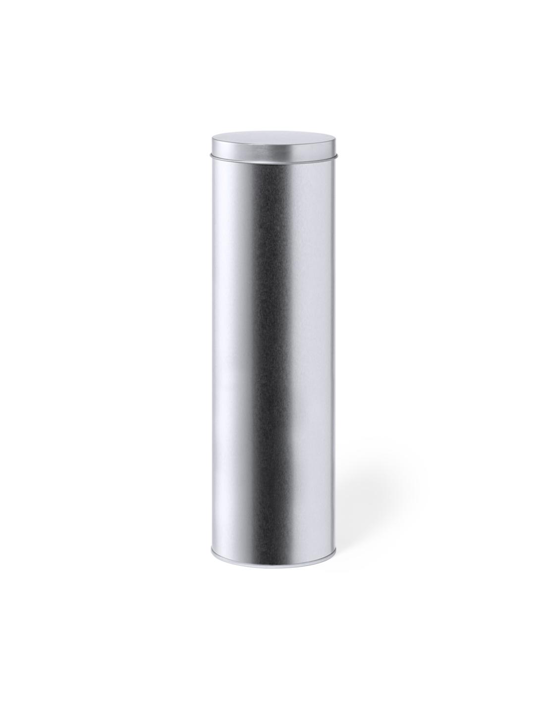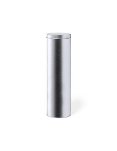 Caja de presentación formato cilíndrico, fabricada en resistente metal de acabado plateado y con tapa a juego.