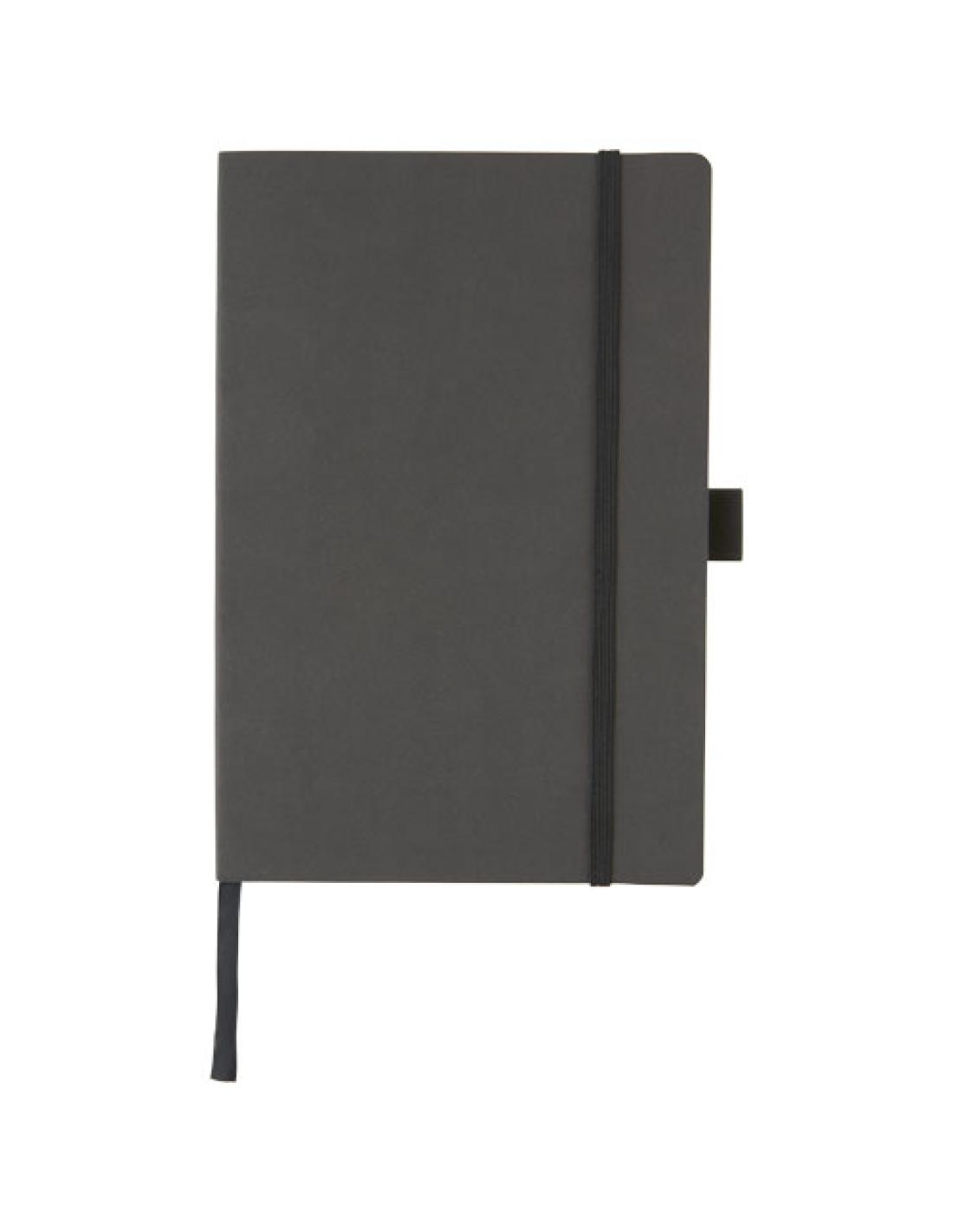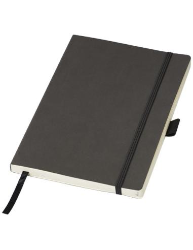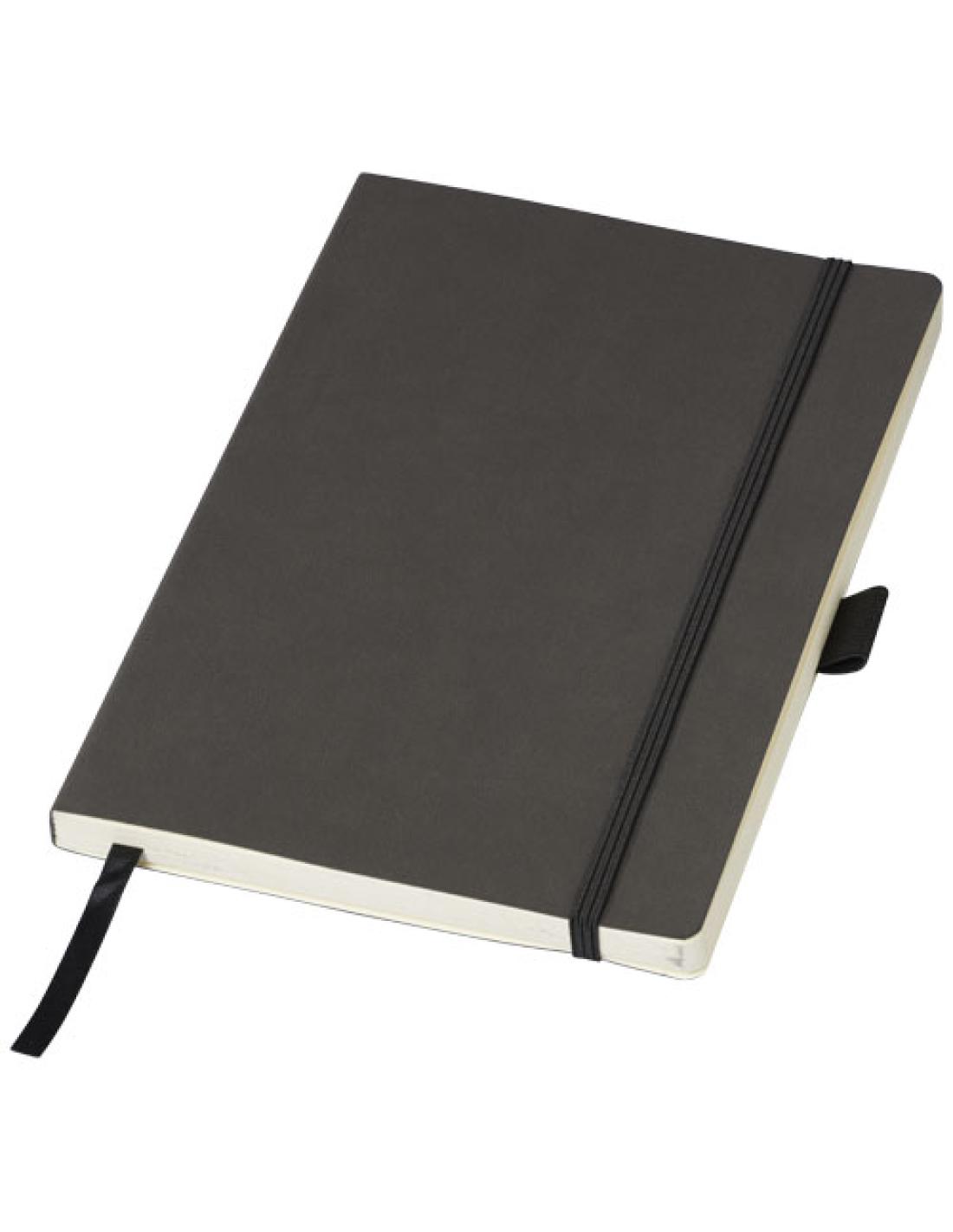 Libreta flexible con cubierta suave al tacto (tamaño A5) con cierre elástico incorporado, cinta marcapáginas, presilla para bolígrafo, bolsillo para documentos en la contraportada interior y 80 hojas (80 g/m²) de papel satinado. Empaquetado en una funda negra.