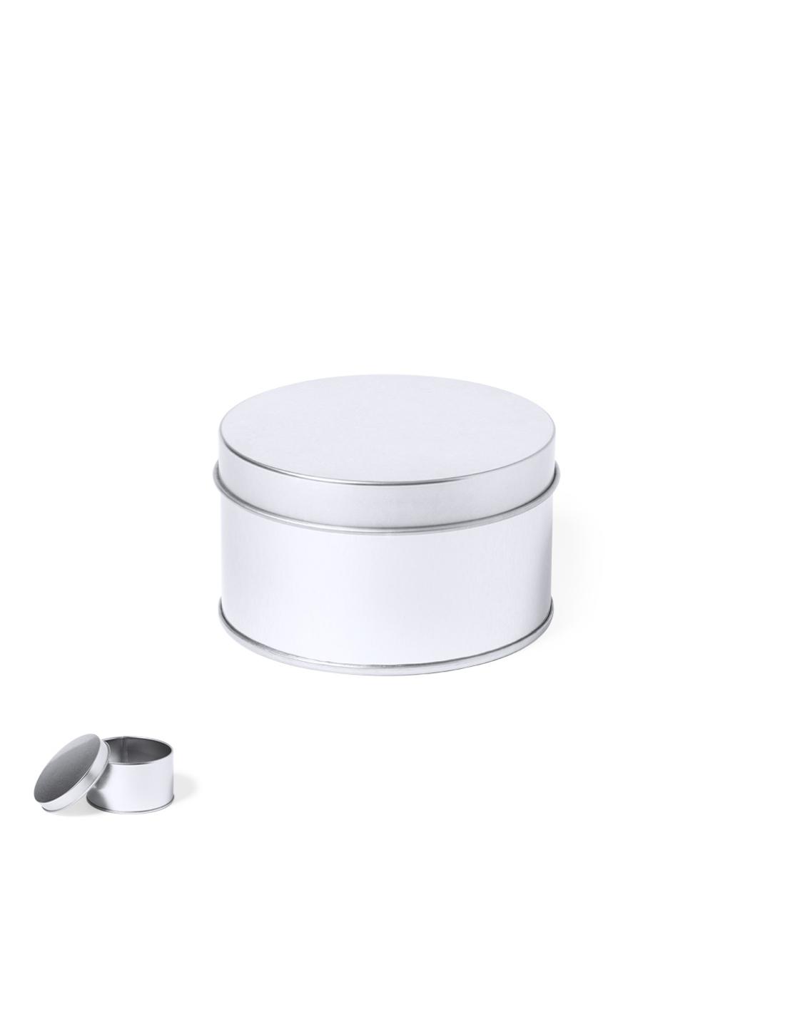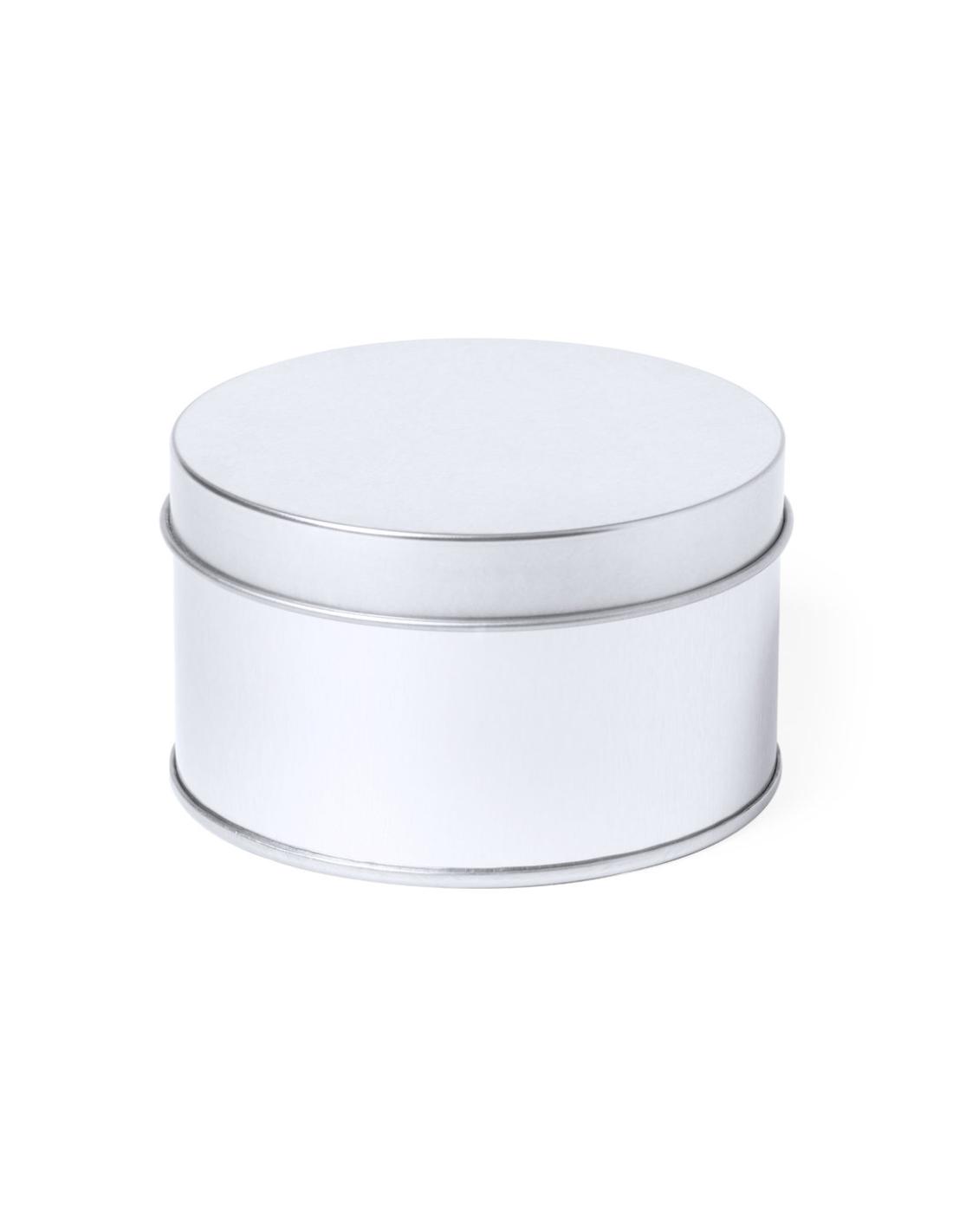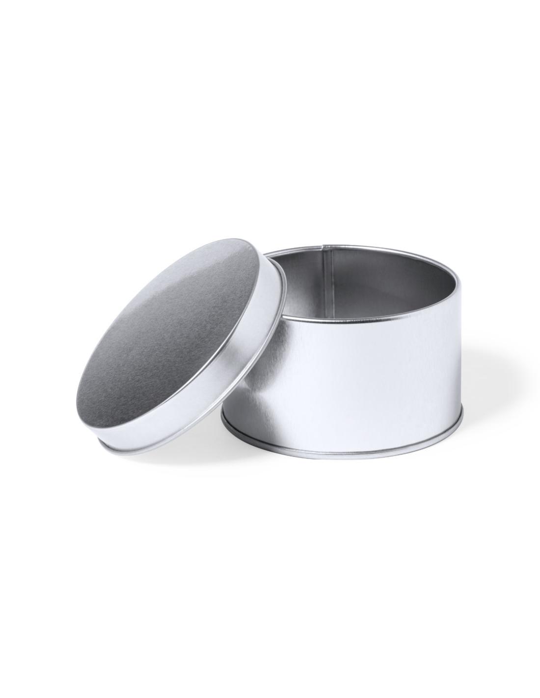 Caja de presentación formato redondo, fabricada en resistente metal de acabado plateado y con tapa a juego.