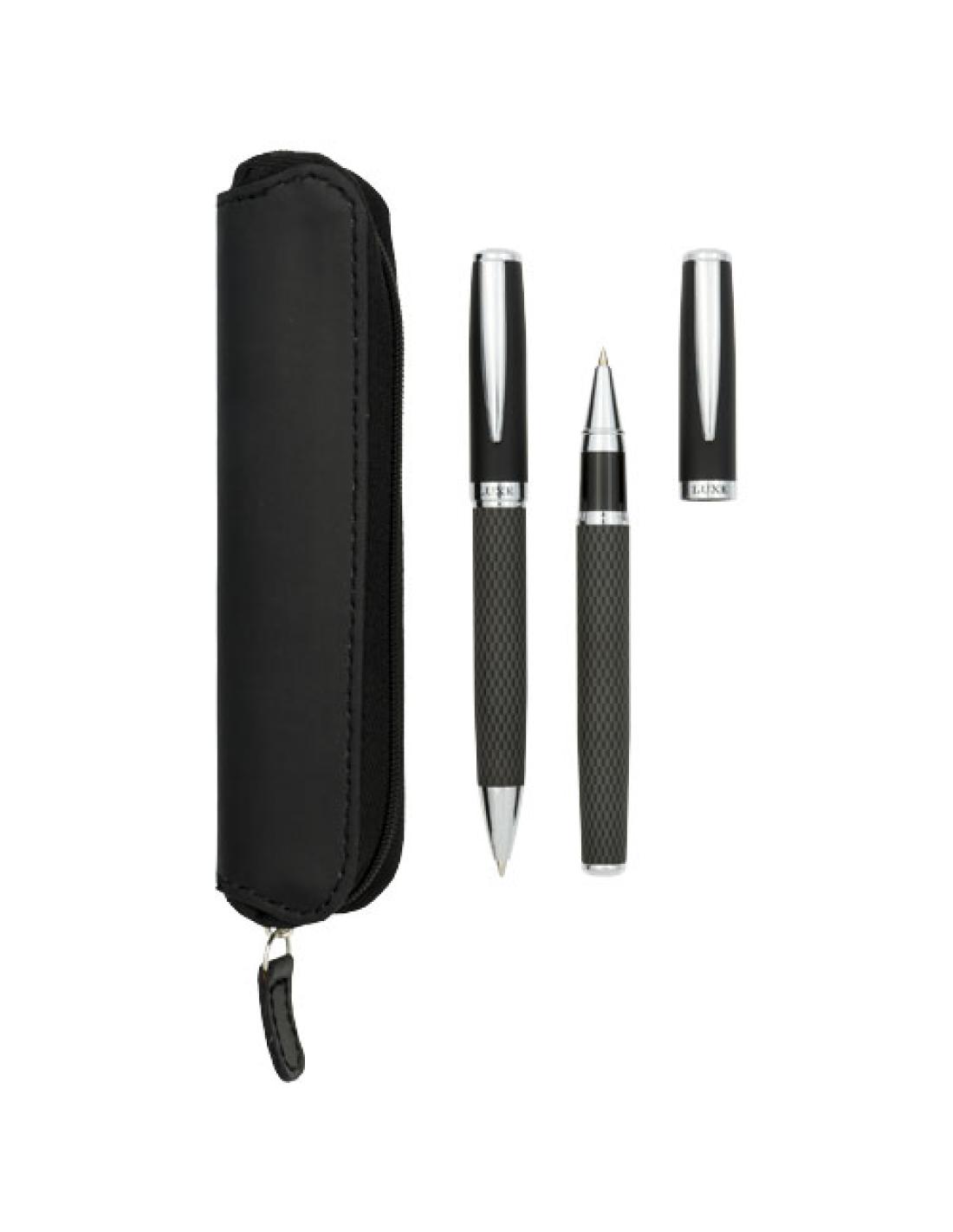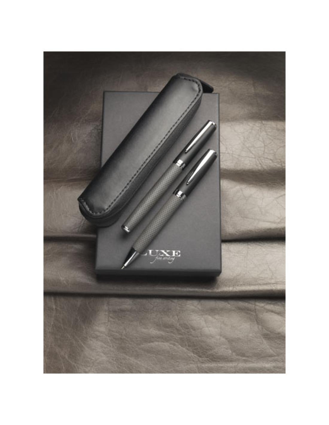 Para una versión ligeramente diferente del negro, esta pareja de bolígrafo y rollerball de diseño exclusivo tiene un acabado en fibra de carbono impresa. Incluye una funda protectora de calidad, empaquetada en una caja de regalo "LUXE".