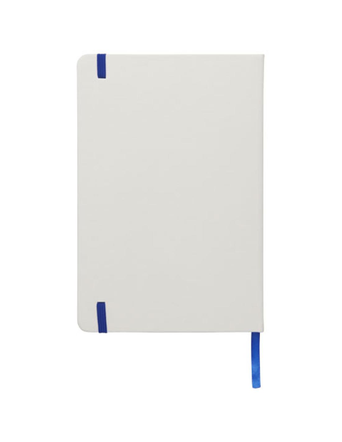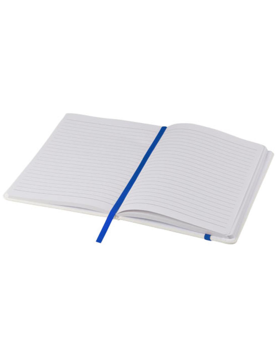 Libreta blanca A5 con cierre elástico de color y cinta. Incluye 80 hojas (60g / m2) de papel rayado. Impresión digital posible en la portada.