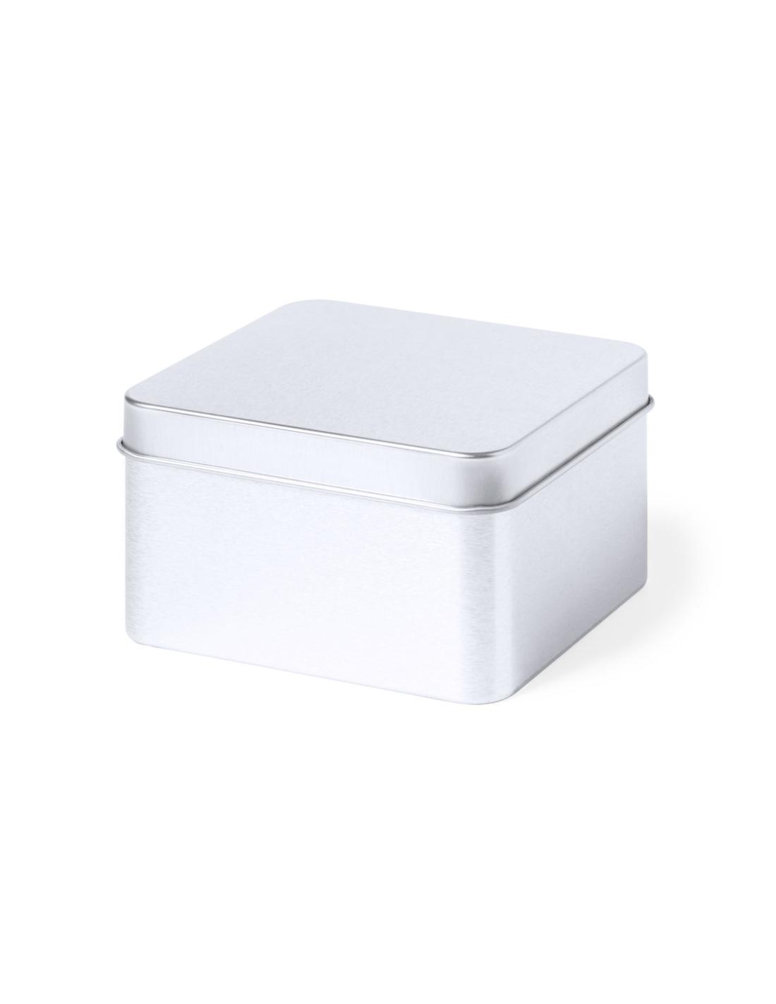 Caja de presentación formato cuadrado, fabricada en resistente metal de acabado plateado y con tapa a juego.