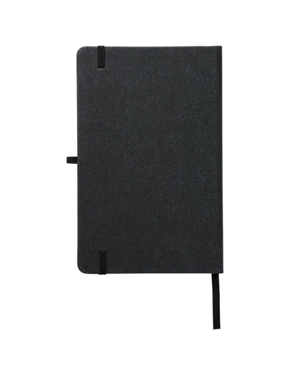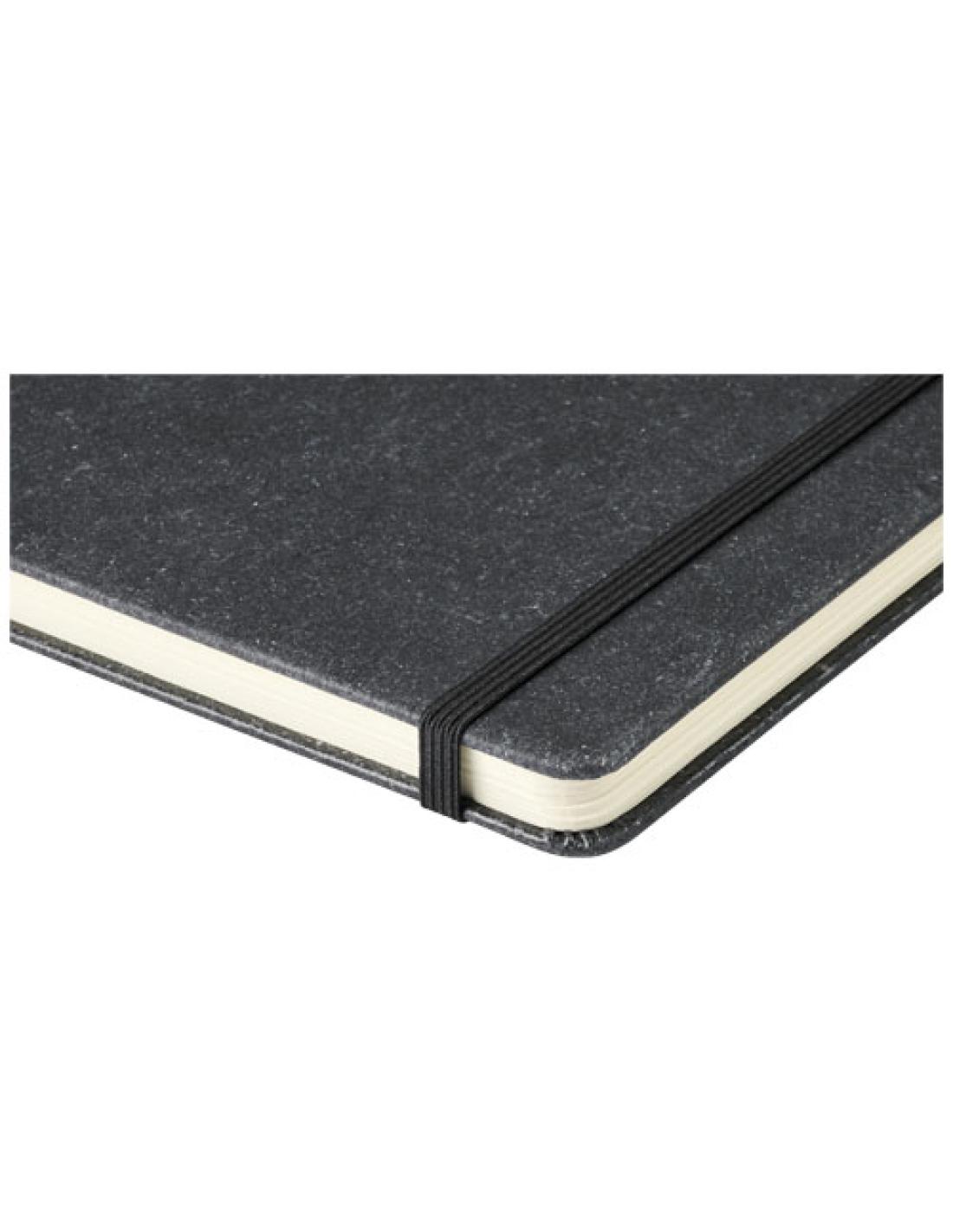 Libreta de referencia de tamaño A5 con tapa con retales de piel. Cuenta con una banda elástica, un soporte para bolígrafo, cinta marcapáginas y 80 hojas de papel rayado de 80 g/m².