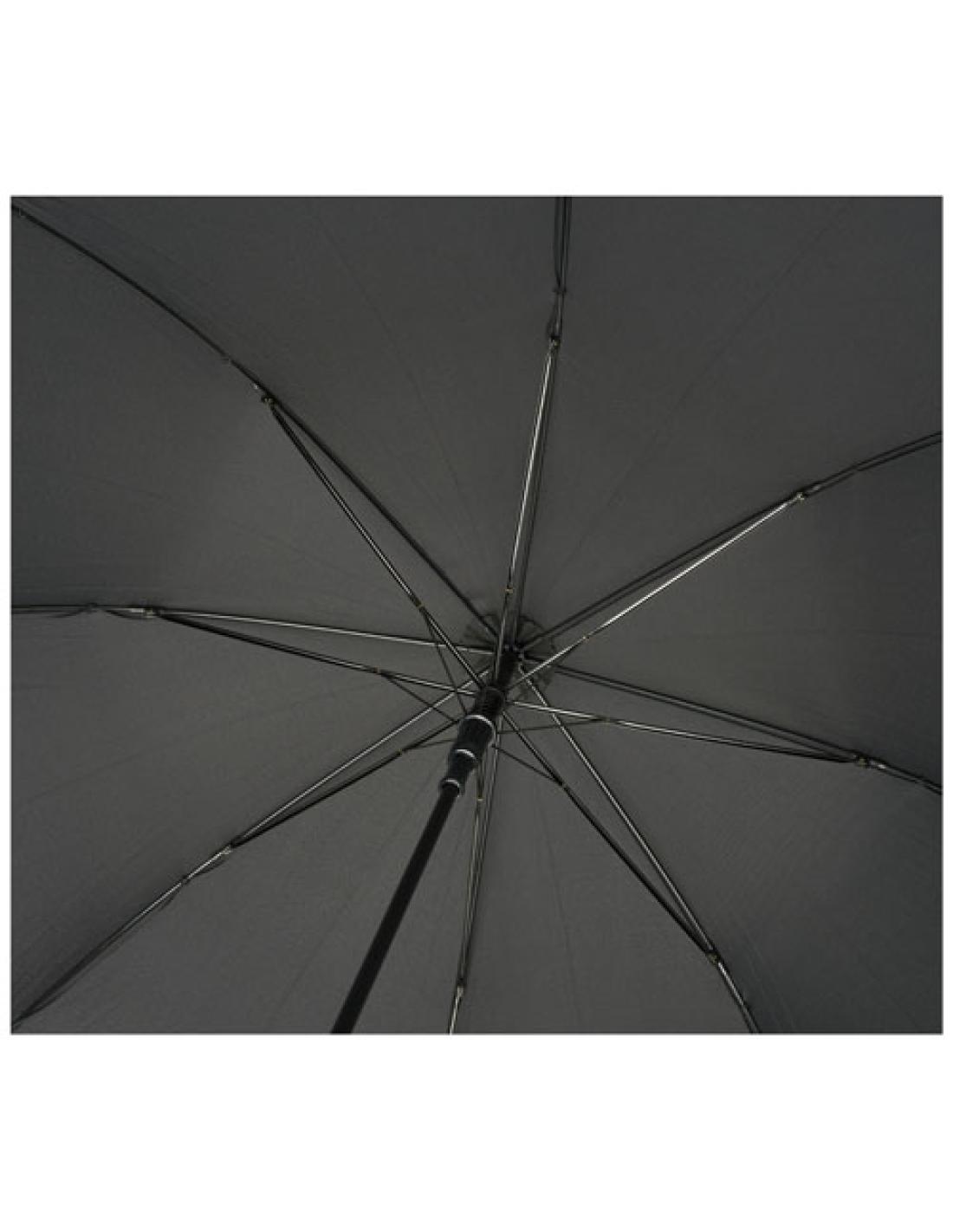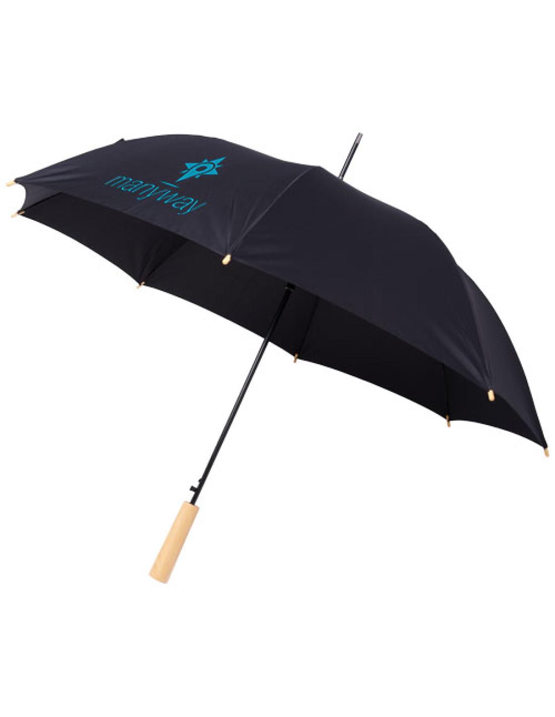 Paraguas de apertura automática con capa externa de poliéster de tafetán de tereftalato de polietileno reciclado. Eje metálico robusto y estructura de alta calidad con varillas de fibra de vidrio que ofrece flexibilidad en condiciones de viento. Se trata de una opción más sostenible gracias al mango de madera, las puntas de las varillas y la capa externa de poliéster de tafetán de tereftalato de polietileno reciclado. Disponible en una amplia variedad de colores contemporáneos con una gran zona de decoración en cada uno de los paneles.