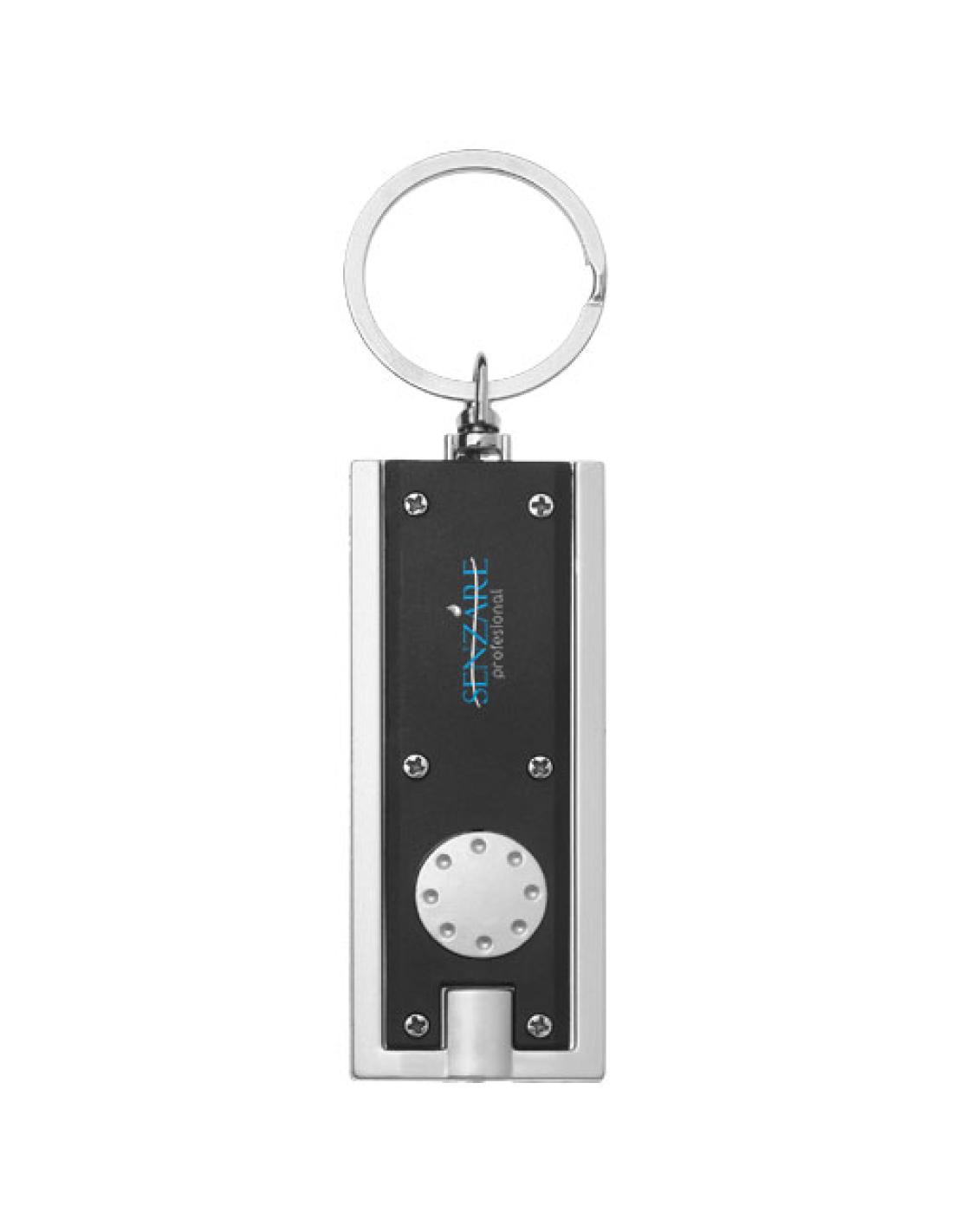 Un llavero con LED blanco de alta luminosidad con pulsador. Llavero con anillo de metal dividido. Pilas incluidas.