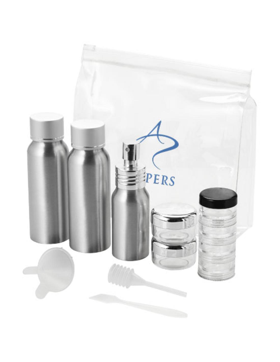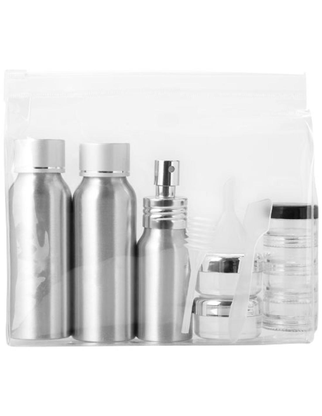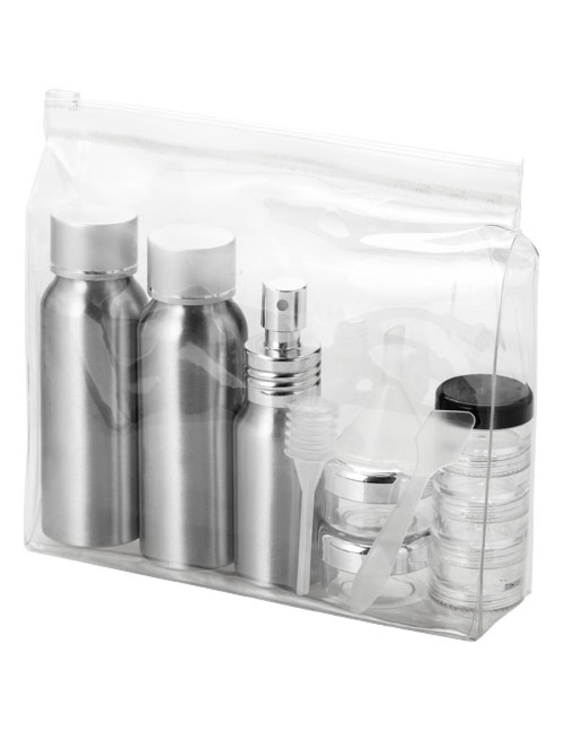 Contiene 2 botes de aluminio de 80 ml, 1 pulverizador de aluminio de 30 ml, 2 frascos de 0,5 onzas, 1 frasco de 4 capas, embudo, espátula y succionador. Los botes, el embudo y demás se entregan en una bolsa de plástico, separados del neceser. No permite la grabación de los componentes.