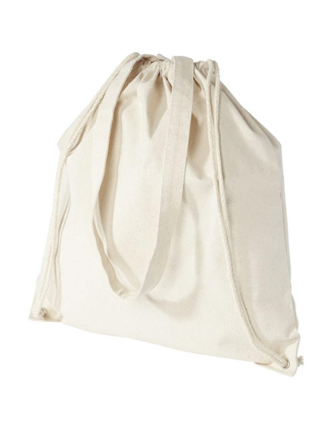 Bolsa de algodón multifuncional con asas largas y cuerda que se puede llevar como bolso o mochila. Gran compartimento principal con cierre de cuerda. Cuenta con dos asas extensibles de 31 cm de longitud. Capacidad: 1,5 l, resistencia para hasta 5 kg.