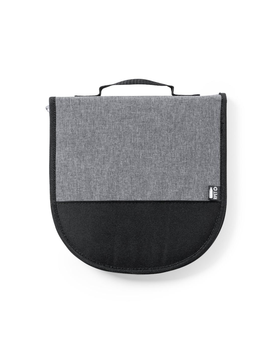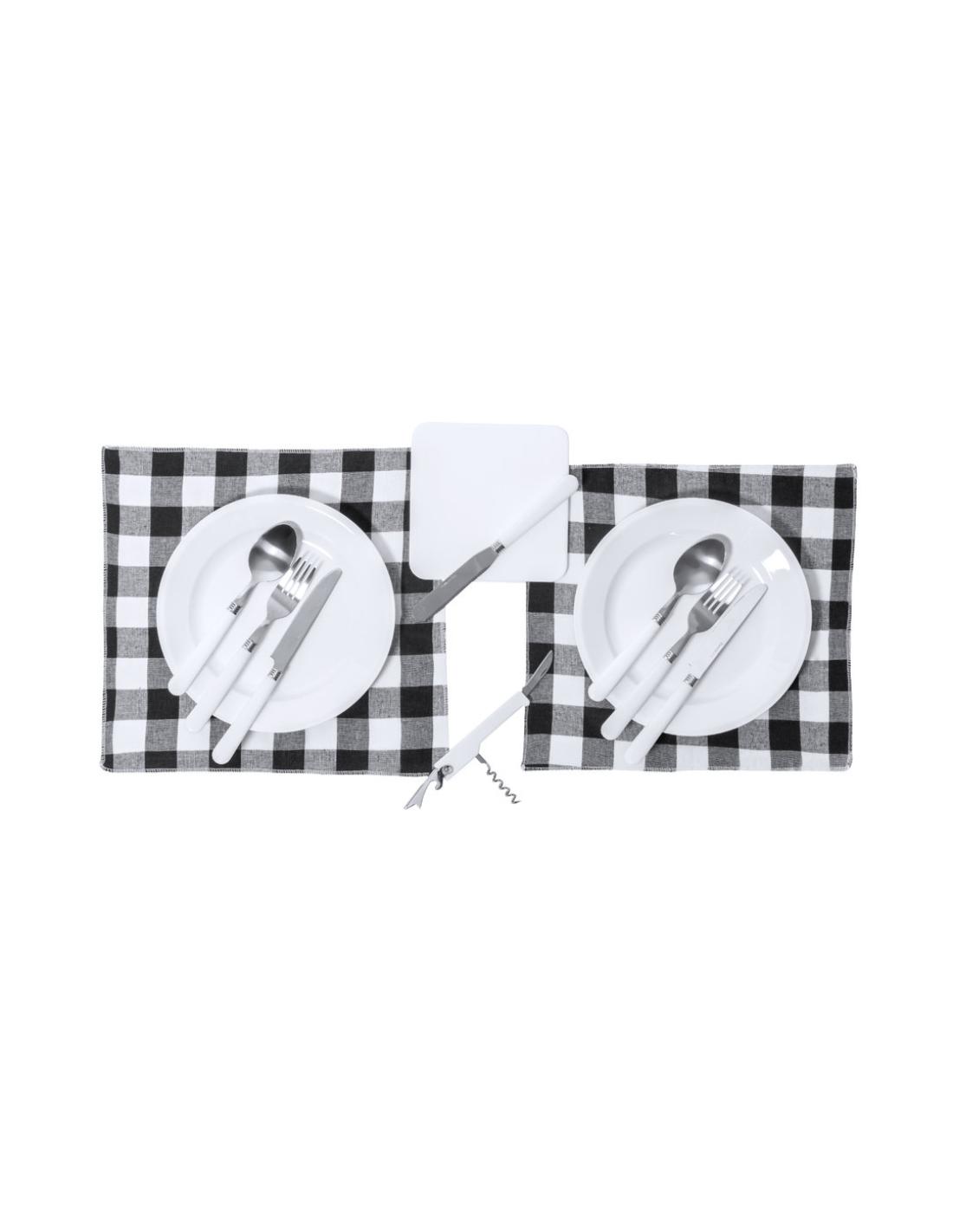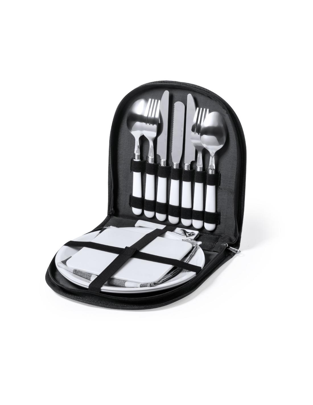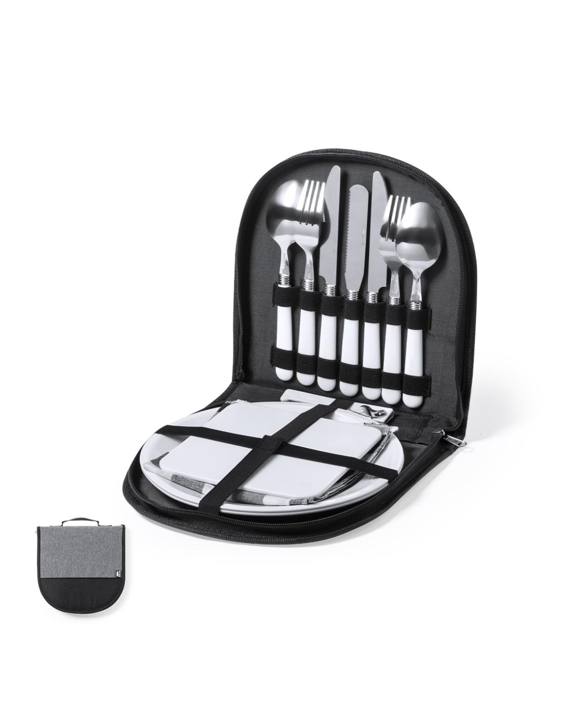 Original set de picnic de 2 servicios. Presentado en resistente funda 600D RPET, con cierre de cremallera, asa de transporte y etiqueta exterior con distintivo RPET. Interior reforzado, con compartimentos para los diferentes accesorios. Contenido: 2 cucharas, 2 cuchillos, 1 cuchillo de untar y 2 tenedores en acero inox con mango en PP blanco2 platos en PP blanco de 23 cm de diámetro.2 servilletas en tela de 29 x 29 cm. Con diseño retro en patrón a cuadros y en combinación tonos negros, grises y blancos.Tabla de corte y presentación de 15 x 15 cm, en PP blanco.El material RPET de la funda se elabora a partir de plástico reciclado, para así fomentar la reutilización de residuos plásticos y ayudar a la sostenibilidad del planeta.