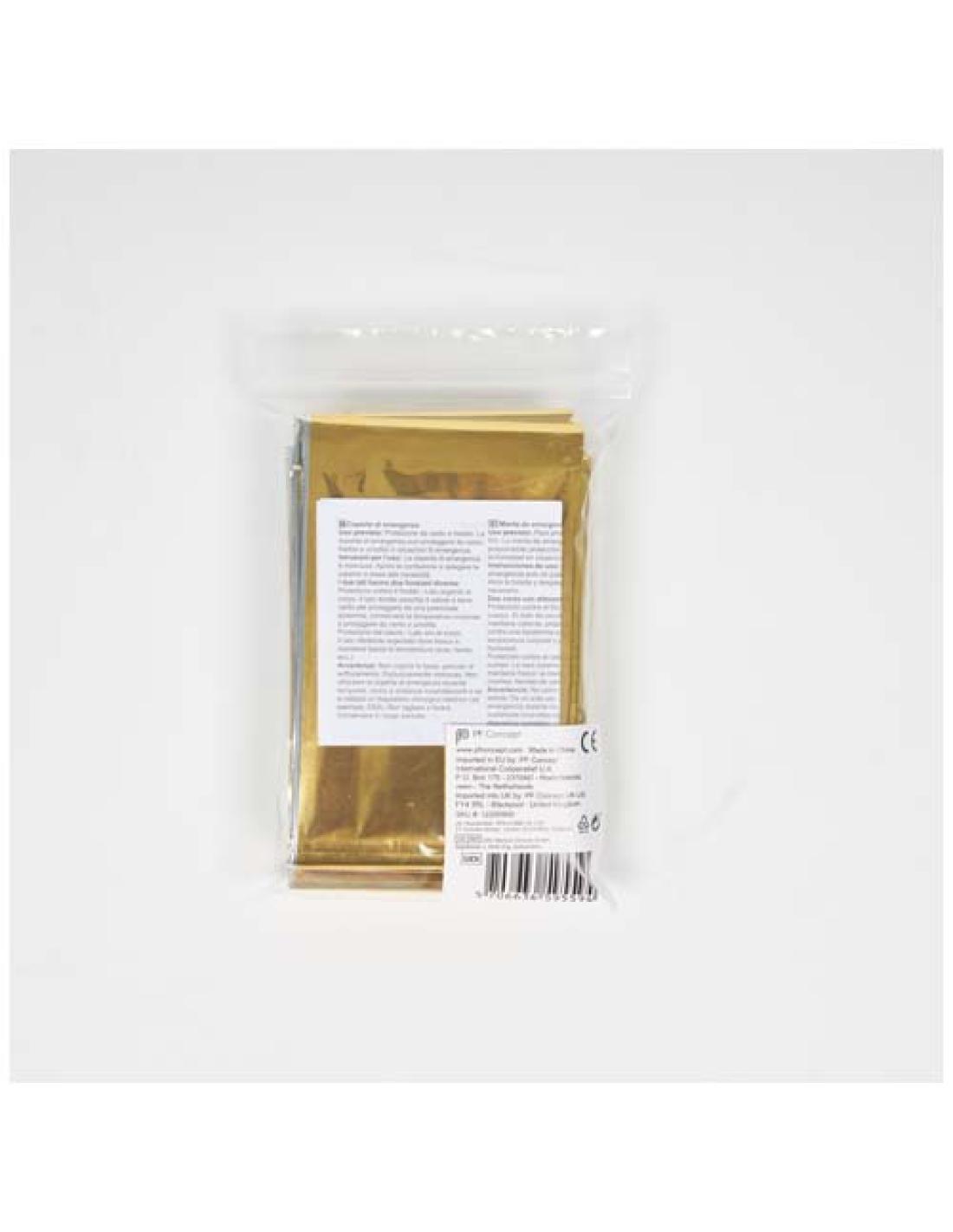 Manta de emergencia que puede proporcionar protección contra el calor, el frío y la humedad. Perfecta para acampadas, eventos deportivos y situaciones de emergencia. Cuando el lado plateado se coloca contra el cuerpo, ofrece protección contra el frío. Con el lado dorado contra el cuerpo, te mantiene fresco. El tamaño de la manta es de 160 x 210 cm. La manta está regulada, probada y certificada como Dispositivo médico de Clase I de acuerdo con la Directiva de Dispositivos médicos MDD 93/42/CEE del 14 de junio de 1993.