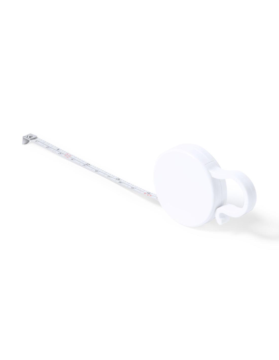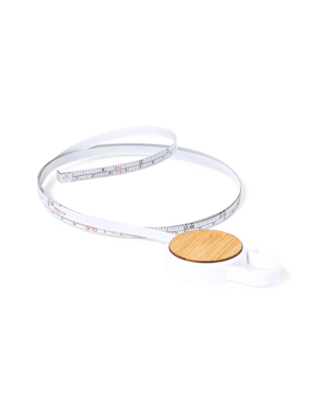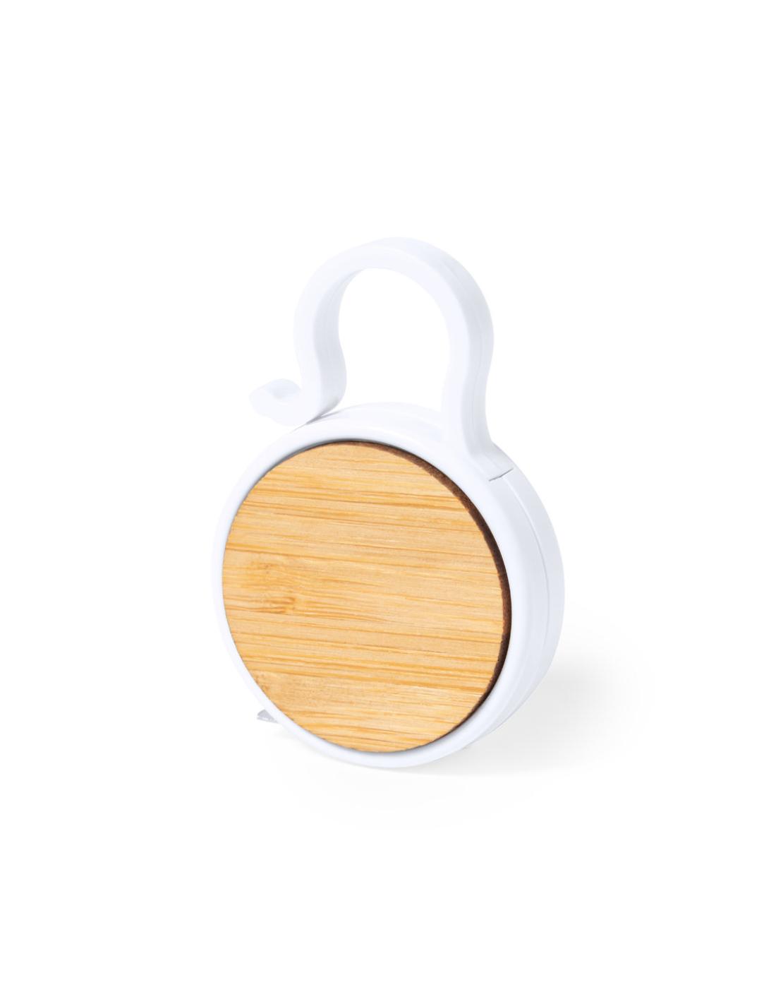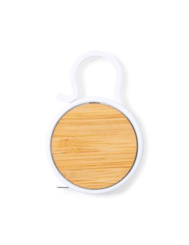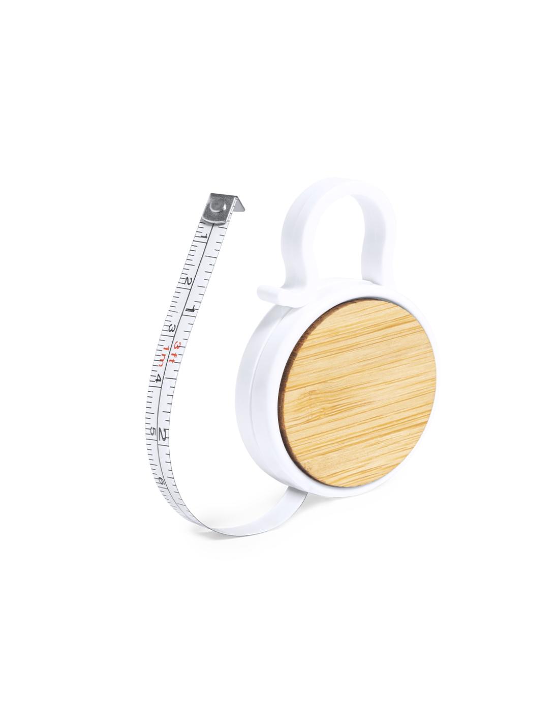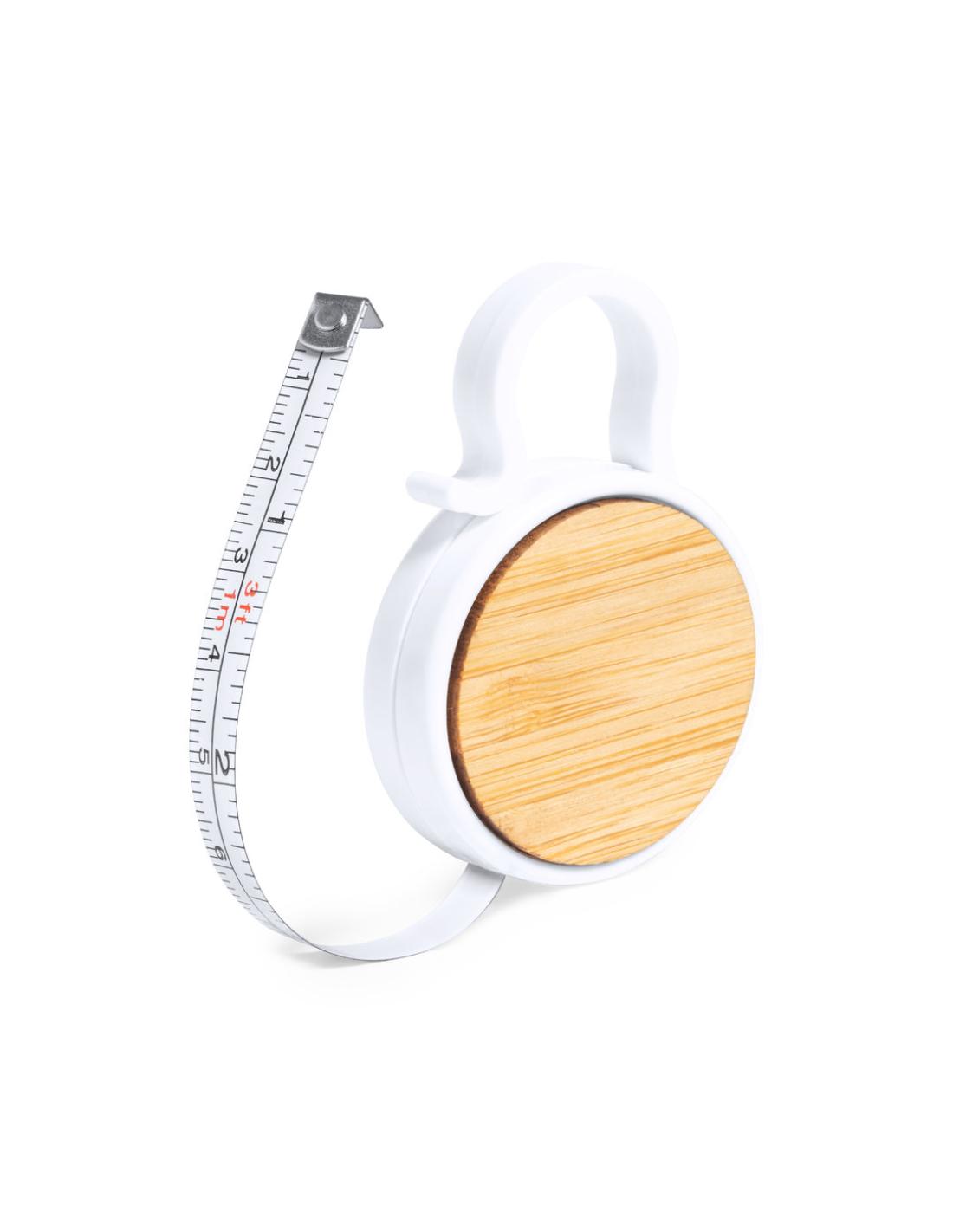 Flexómetro 1 m en resistente ABS blanco, con detalle en bambú en el cuerpo y anilla de transporte. Con amplia superficie de marcaje y hoja con medidas en centímetros y pulgadas.