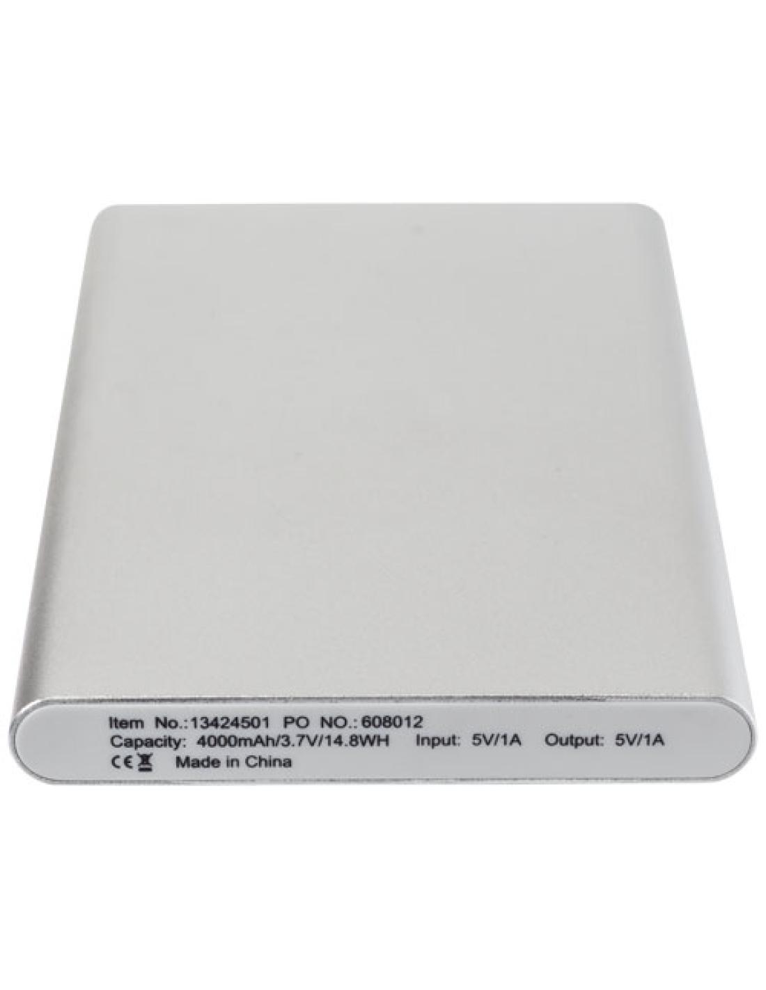 Esta delgada y ligera batería externa de aluminio contiene una batería de polímero de litio y grado A con una capacidad de 4000 mAh. Los indicadores LED se iluminan durante la carga y muestran la carga restante de la batería externa. La entrada de la batería es de 5 V/1 A y la salida es de 5 V/1 A. Incluye un cable de carga de Tipo C a USB A. Presentado en una caja blanca.