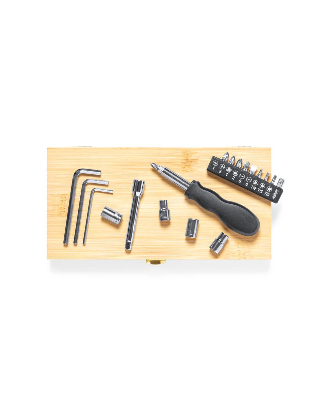 Set de herramientas de línea nature, presentado en resistente caja de bambú con cierre metálico. Con interior troquelado en bambú para un perfecto ajuste de las herramientas. Incluye destornillador con multitud de puntas planas, philips, hexagonales y torx juego de llaves allen en distintas medidas y llaves de tubo con accesorio alargador. Presentado en caja individual de diseño kraft.